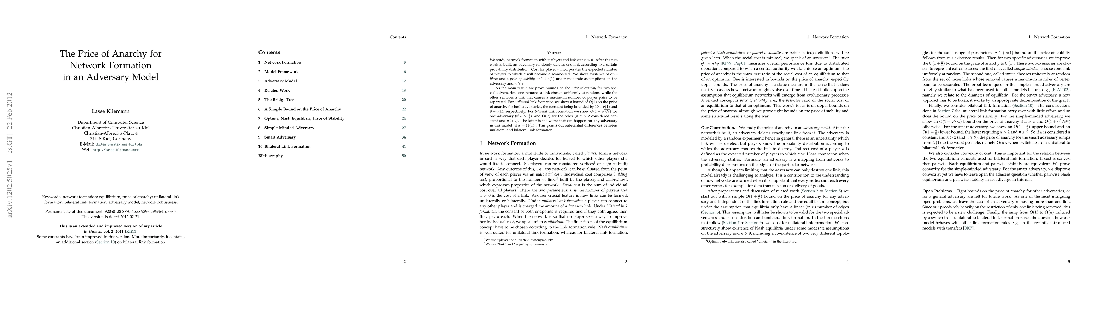 Researchers study network formation with players and link costs in an adversary model, finding bounds on the price of anarchy for different types of adversaries and link formations.