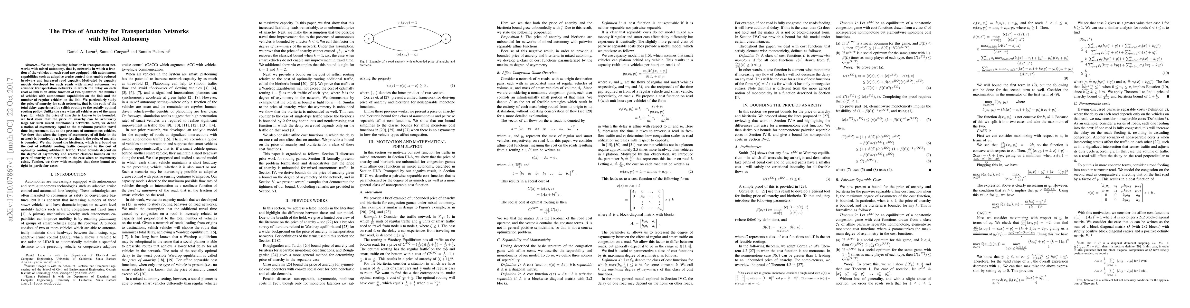 This paper examines the price of anarchy in transportation networks with mixed autonomous and regular vehicles, showing that the price of anarchy can be arbitrarily large. It introduces a notion of asymmetry and proves that when asymmetry is bounded by a factor less than 4, the price of anarchy remains bounded, providing tight bounds on the bicriteria.