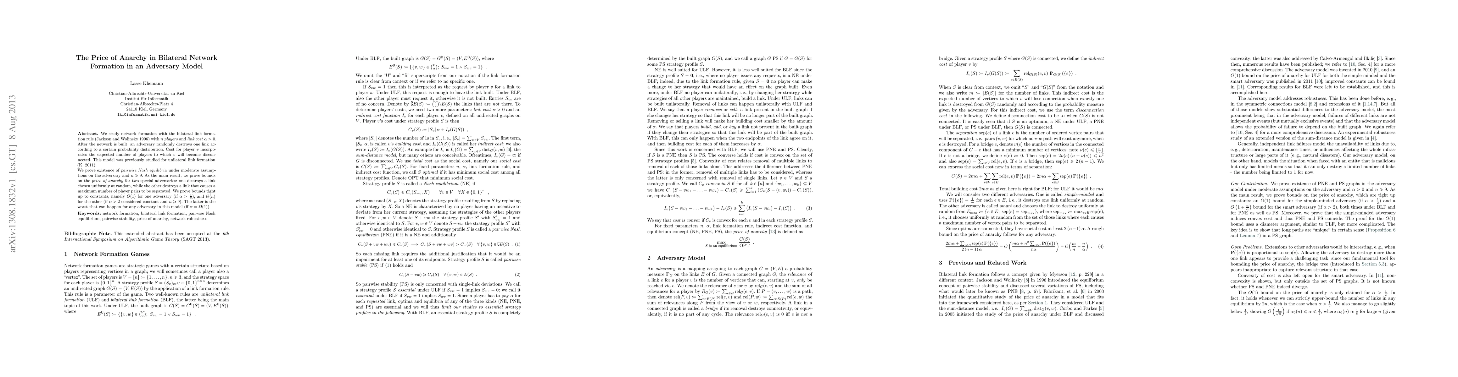 We study network formation with the bilateral link formation rule (Jackson and Wolinsky 1996) with $n$ players and link cost $\alpha>0$. After the network is built, an adversary randomly destroys one link according to a certain probability distribution. Cost for player $v$ incorporates the expected number of players to which $v$ will become disconnected. This model was previously studied for unilateral link formation (K. 2011). We prove existence of pairwise Nash equilibria under moderate assumptions on the adversary and $n\geq 9$. As the main result, we prove bounds on the price of anarchy for two special adversaries: one destroys a link chosen uniformly at random, while the other destroys a link that causes a maximum number of player pairs to be separated. We prove bounds tight up to constants, namely $O(1)$ for one adversary (if $\alpha>1/2$), and $\Theta(n)$ for the other (if $\alpha>2$ considered constant and $n \geq 9$). The latter is the worst that can happen for any adversary in this model (if $\alpha=\Omega(1)$).