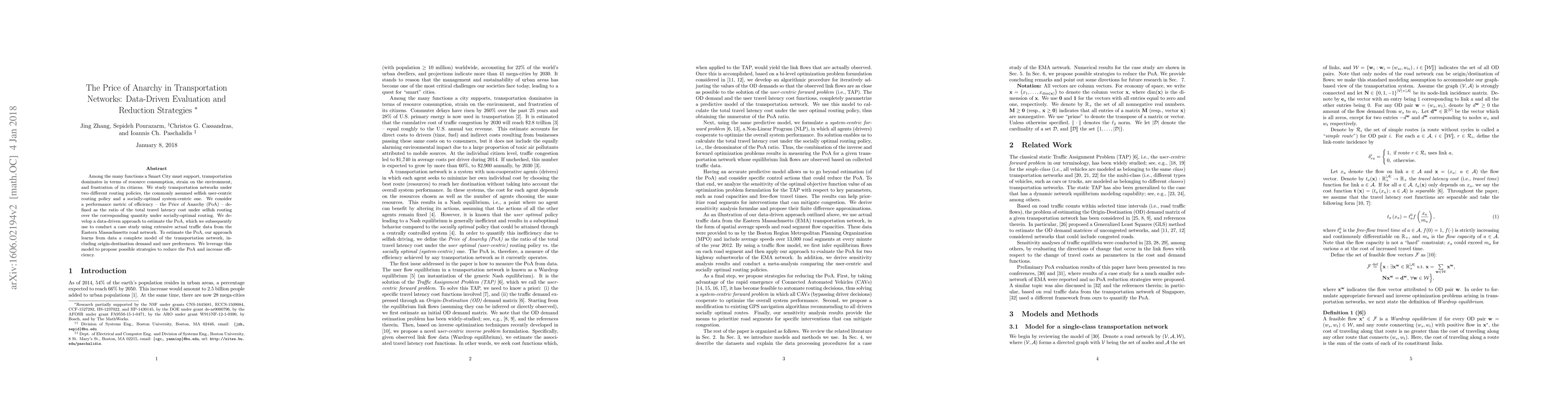 This paper evaluates the Price of Anarchy (PoA) in transportation networks under selfish and socially-optimal routing policies using data-driven methods. It proposes strategies to reduce PoA and improve efficiency based on a comprehensive traffic data model of the Eastern Massachusetts road network.
