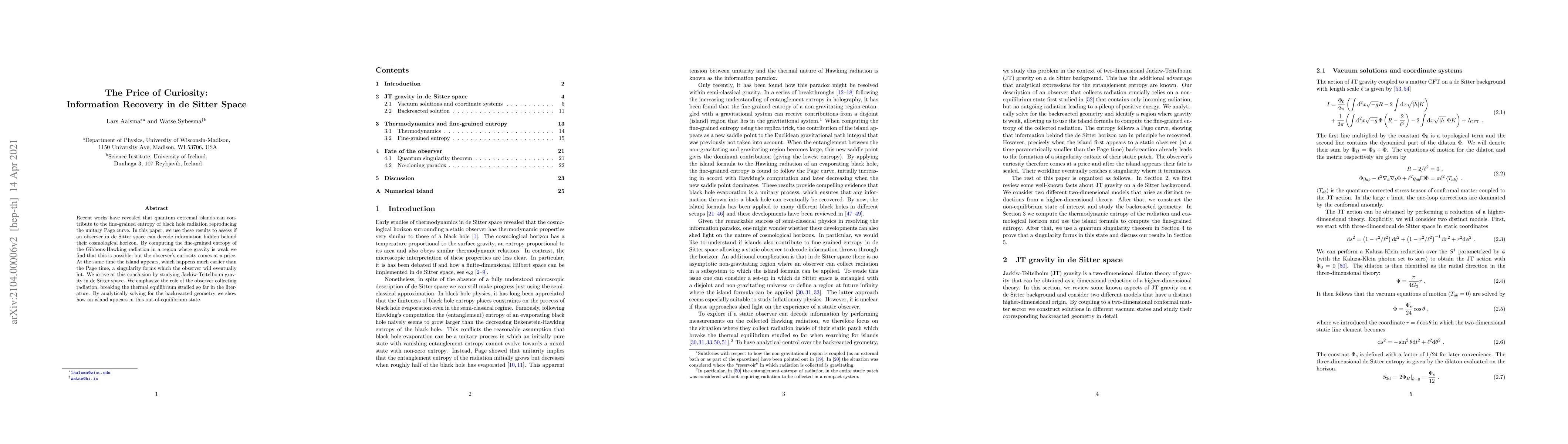 Recent works have revealed that quantum extremal islands can contribute to the fine-grained entropy of black hole radiation reproducing the unitary Page curve. In this paper, we use these results to assess if an observer in de Sitter space can decode information hidden behind their cosmological horizon. By computing the fine-grained entropy of the Gibbons-Hawking radiation in a region where gravity is weak we find that this is possible, but the observer's curiosity comes at a price. At the same time the island appears, which happens much earlier than the Page time, a singularity forms which the observer will eventually hit. We arrive at this conclusion by studying Jackiw-Teitelboim gravity in de Sitter space. We emphasize the role of the observer collecting radiation, breaking the thermal equilibrium studied so far in the literature. By analytically solving for the backreacted geometry we show how an island appears in this out-of-equilibrium state.