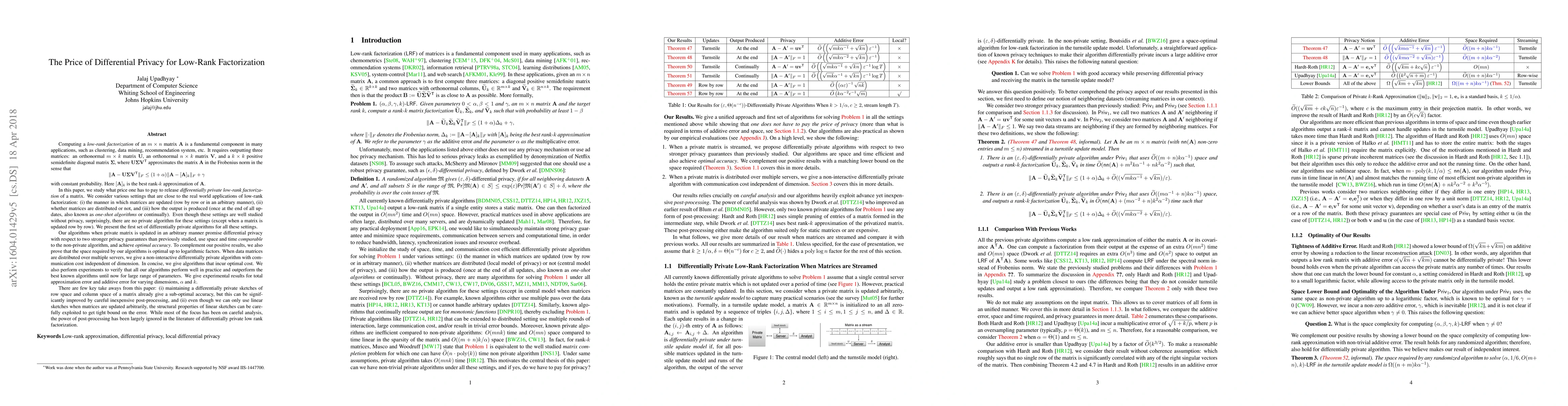 This paper presents the first differentially private algorithms for various real-world settings of low-rank factorization, including arbitrary updates, distributed matrices, and one-shot or continual output. The proposed algorithms achieve optimal accuracy and space efficiency while maintaining strong privacy guarantees.