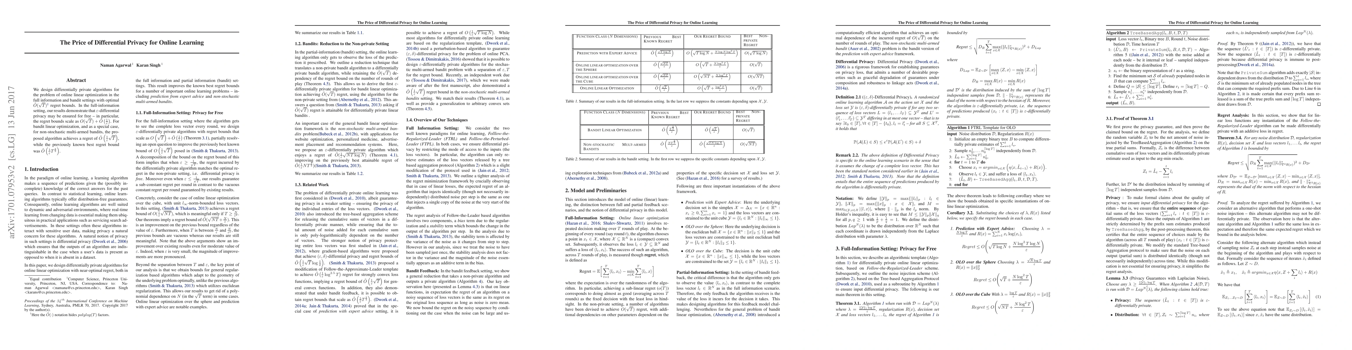 We design differentially private algorithms for the problem of online linear optimization in the full information and bandit settings with optimal $\tilde{O}(\sqrt{T})$ regret bounds. In the full-information setting, our results demonstrate that $\epsilon$-differential privacy may be ensured for free -- in particular, the regret bounds scale as $O(\sqrt{T})+\tilde{O}\left(\frac{1}{\epsilon}\right)$. For bandit linear optimization, and as a special case, for non-stochastic multi-armed bandits, the proposed algorithm achieves a regret of $\tilde{O}\left(\frac{1}{\epsilon}\sqrt{T}\right)$, while the previously known best regret bound was $\tilde{O}\left(\frac{1}{\epsilon}T^{\frac{2}{3}}\right)$.