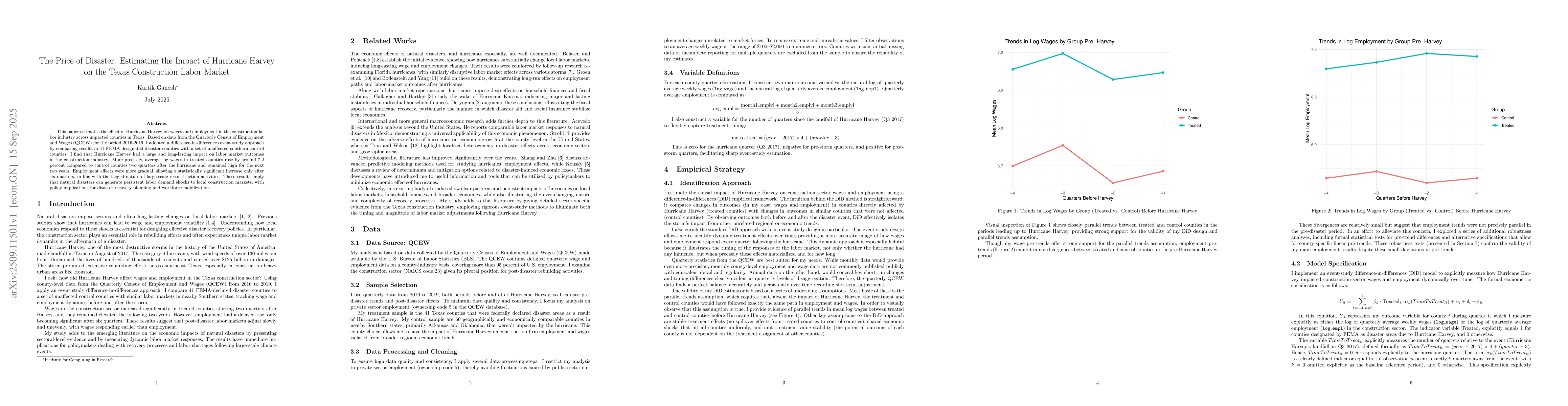 The study contributes a robust econometric framework incorporating county and quarter fixed effects, along with clustered standard errors, to isolate the causal impact of Hurricane Harvey on labor market outcomes.