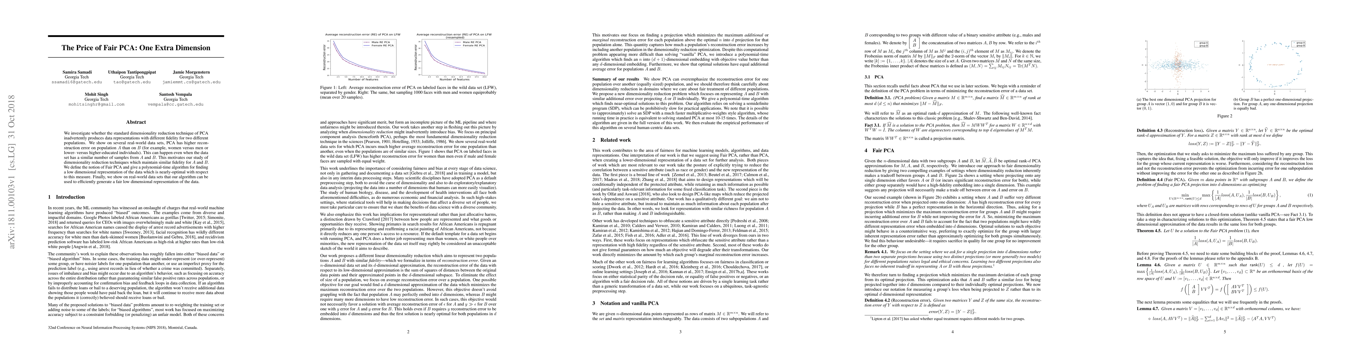 Standard PCA can create data representations with differing fidelity for different populations. Our paper introduces Fair PCA, a new dimensionality reduction technique that maintains similar fidelity across populations.