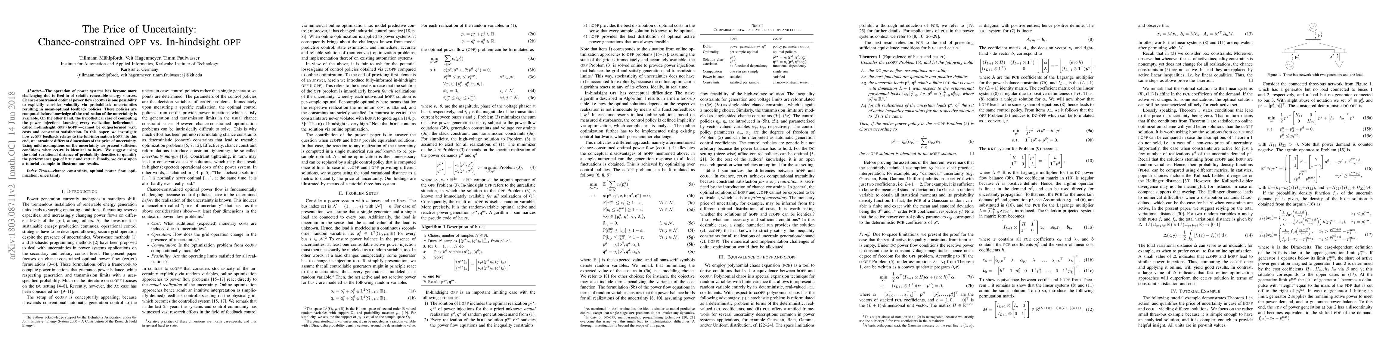 This paper compares chance-constrained optimal power flow (ccOPF) to in-hindsight OPF by introducing a dimension of the price of uncertainty. It finds sufficient conditions under which ccOPF is identical to full-information hOPF.