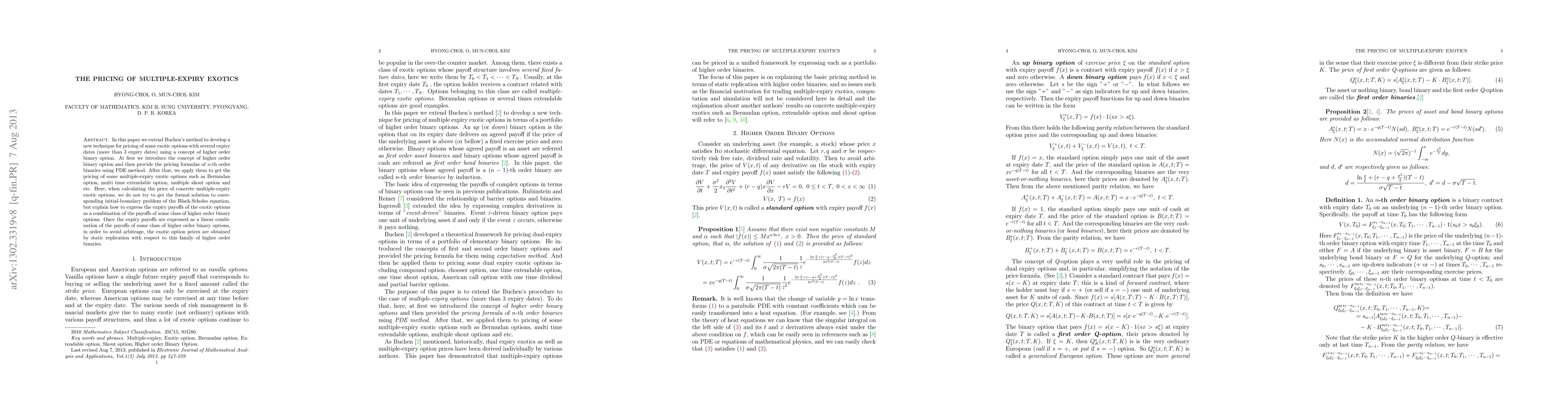 In this paper we extend Buchen's method to develop a new technique for pricing of some exotic options with several expiry dates(more than 3 expiry dates) using a concept of higher order binary option. At first we introduce the concept of higher order binary option and then provide the pricing formulae of $n$-th order binaries using PDE method. After that, we apply them to pricing of some multiple-expiry exotic options such as Bermudan option, multi time extendable option, multi shout option and etc. Here, when calculating the price of concrete multiple-expiry exotic options, we do not try to get the formal solution to corresponding initial-boundary problem of the Black-Scholes equation, but explain how to express the expiry payoffs of the exotic options as a combination of the payoffs of some class of higher order binary options. Once the expiry payoffs are expressed as a linear combination of the payoffs of some class of higher order binary options, in order to avoid arbitrage, the exotic option prices are obtained by static replication with respect to this family of higher order binaries.