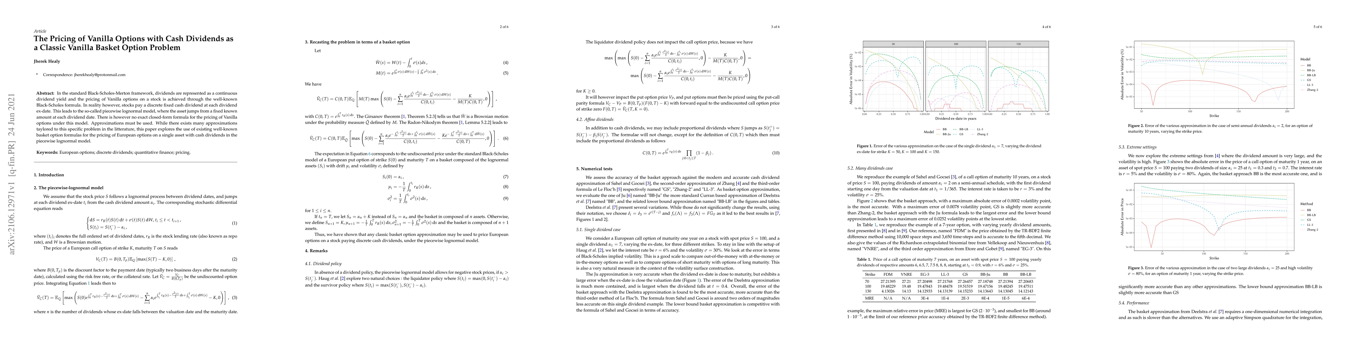 In the standard Black-Scholes-Merton framework, dividends are represented as a continuous dividend yield and the pricing of Vanilla options on a stock is achieved through the well-known Black-Scholes formula. In reality however, stocks pay a discrete fixed cash dividend at each dividend ex-date. This leads to the so-called piecewise lognormal model, where the asset jumps from a fixed known amount at each dividend date. There is however no exact closed-form formula for the pricing of Vanilla options under this model. Approximations must be used. While there exists many approximations taylored to this specific problem in the litterature, this paper explores the use of existing well-known basket option formulas for the pricing of European options on a single asset with cash dividends in the piecewise lognormal model.