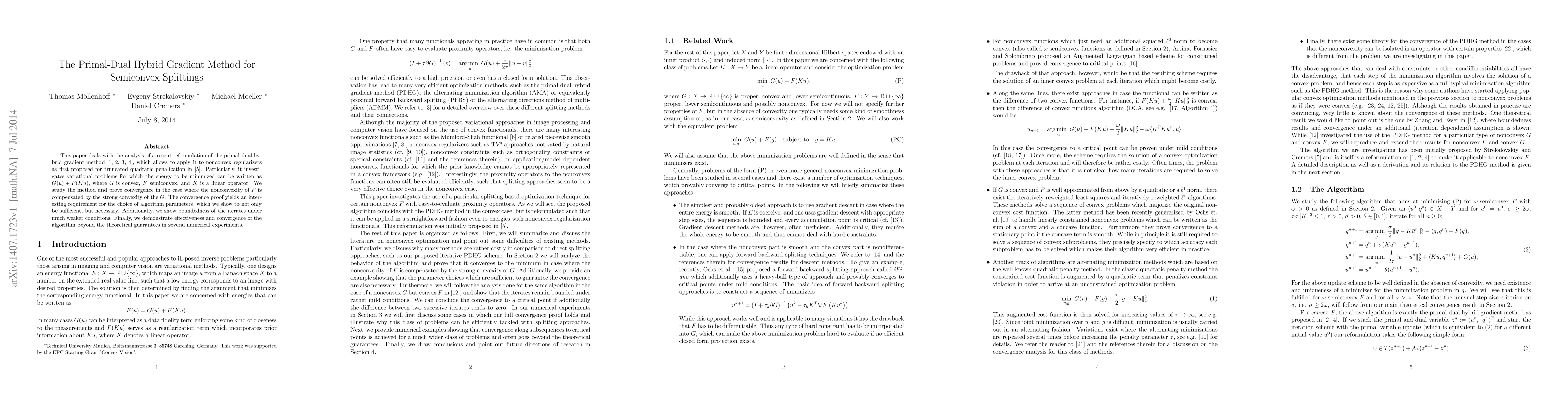 This paper deals with the analysis of a recent reformulation of the primal-dual hybrid gradient method [Zhu and Chan 2008, Pock, Cremers, Bischof and Chambolle 2009, Esser, Zhang and Chan 2010, Chambolle and Pock 2011], which allows to apply it to nonconvex regularizers as first proposed for truncated quadratic penalization in [Strekalovskiy and Cremers 2014]. Particularly, it investigates variational problems for which the energy to be minimized can be written as $G(u) + F(Ku)$, where $G$ is convex, $F$ semiconvex, and $K$ is a linear operator. We study the method and prove convergence in the case where the nonconvexity of $F$ is compensated by the strong convexity of the $G$. The convergence proof yields an interesting requirement for the choice of algorithm parameters, which we show to not only be sufficient, but necessary. Additionally, we show boundedness of the iterates under much weaker conditions. Finally, we demonstrate effectiveness and convergence of the algorithm beyond the theoretical guarantees in several numerical experiments.