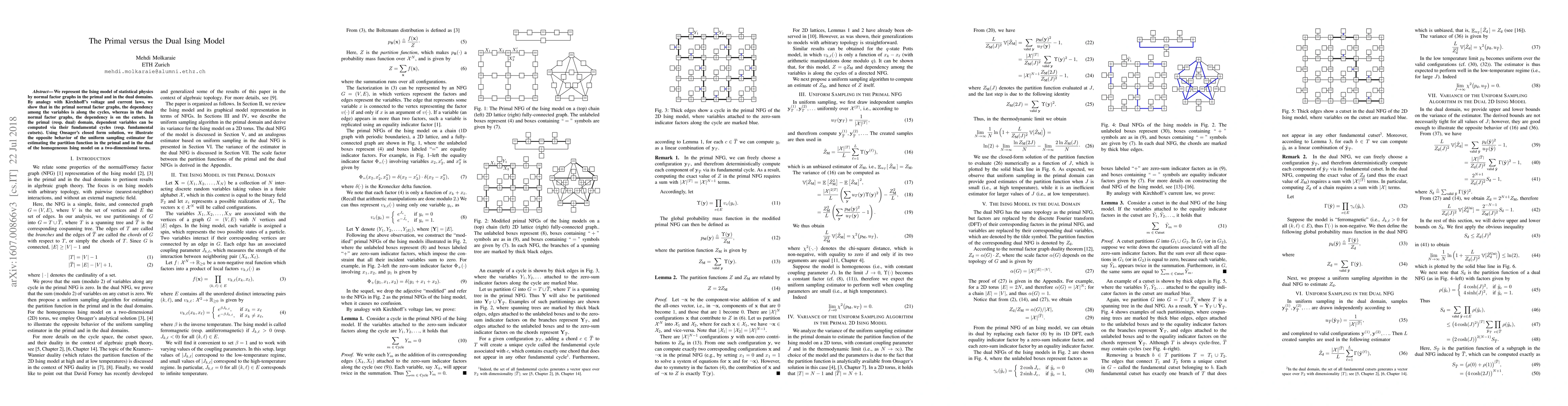 This paper explores the Ising model through primal and dual normal factor graphs, demonstrating how dependencies manifest along cycles in the primal domain and on cutsets in the dual. It uses Onsager's solution to highlight contrasting behaviors of uniform sampling estimators in these domains.