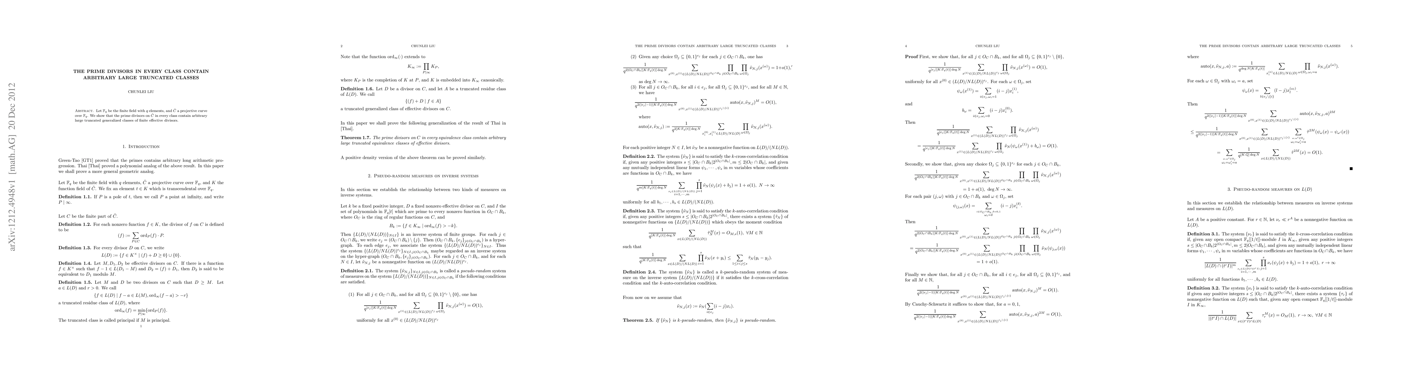 Summary: This paper demonstrates that prime divisors in any class on a projective curve over a finite field can contain arbitrarily large truncated generalized classes of finite effective divisors. The result highlights the extensive structure of these divisors within the given mathematical framework.