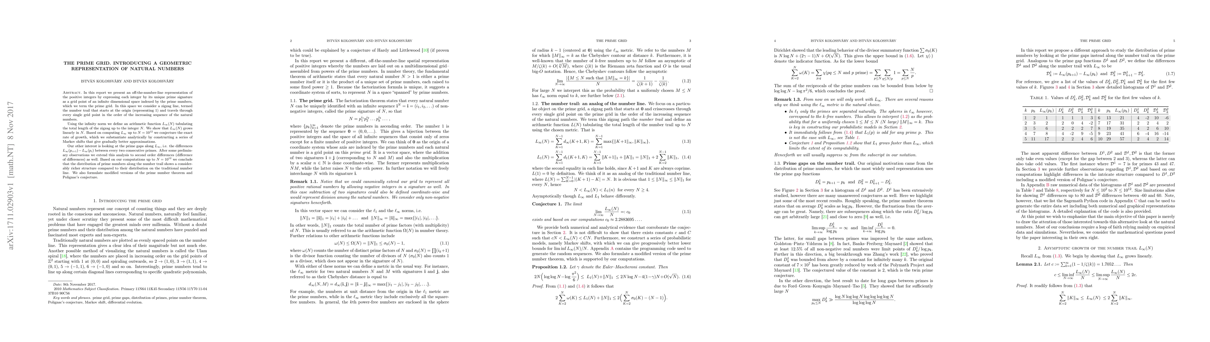 In this report we present an off-the-number-line representation of the positive integers by expressing each integer by its unique prime signature as a grid point of an infinite dimensional space indexed by the prime numbers, which we term the prime grid. In this space we consider a zigzag line, termed the number trail that starts at the origin (representing 1) and travels through every single grid point in the order of the increasing sequence of the natural numbers. Using the infinity norm we define an arithmetic function $L_\infty (N)$ tabulating the total length of the zigzag up to the integer $N$. We show that $L_\infty(N)$ grows linearly in $N$. Based on computing $L_\infty$ up to $N=10^{12}$ we conjecture the exact rate of growth, which we substantiate analytically by constructing a series of Markov shifts that give gradually better approximations. Our other interest is looking at the prime gaps along $L_\infty$, i.e. the differences $L_\infty (p_{i+1} )-L_\infty (p_i )$ between every two consecutive primes. After some preliminary observations we extend this analysis to second order differences (difference of differences) as well. Based on our computations up to $N=10^{12}$ we conclude that the distribution of prime numbers along the number trail shows a considerably richer structure compared to their distribution on the traditional number line. We also formulate modified versions of the prime number theorem and Polignac's conjecture.