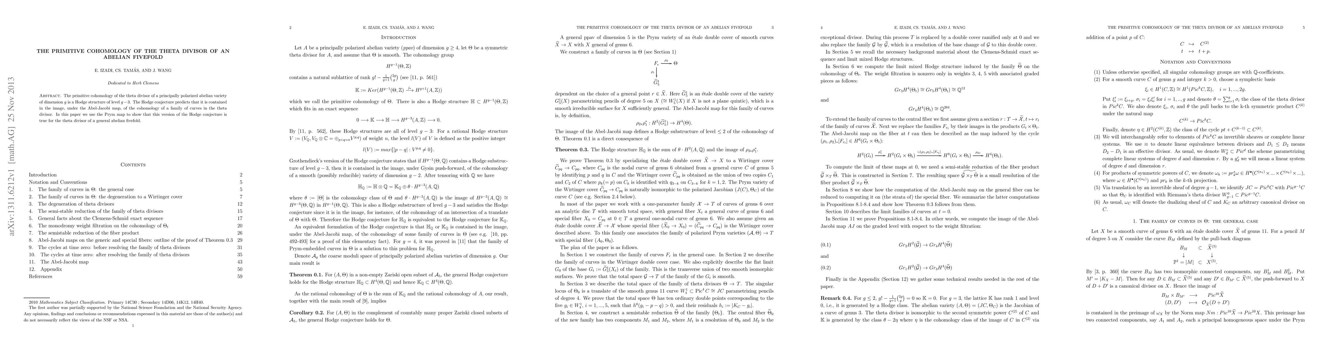 This paper demonstrates that the primitive cohomology of the theta divisor in an abelian fivefold adheres to the Hodge conjecture, utilizing the Prym map to validate this for general abelian fivefolds. The result confirms the conjecture's prediction for the cohomology of the theta divisor.