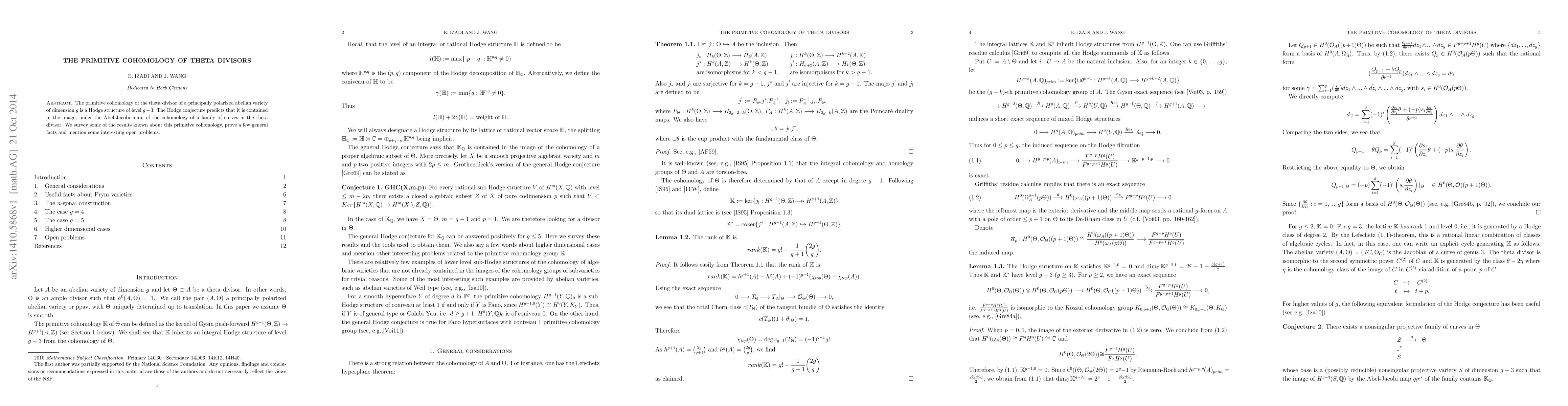 This paper surveys the primitive cohomology of theta divisors in principally polarized abelian varieties, establishing it as a Hodge structure of level $g-3$. It explores the conjecture that this cohomology is imaged under the Abel-Jacobi map from a family of curves, and highlights some open problems in this area.