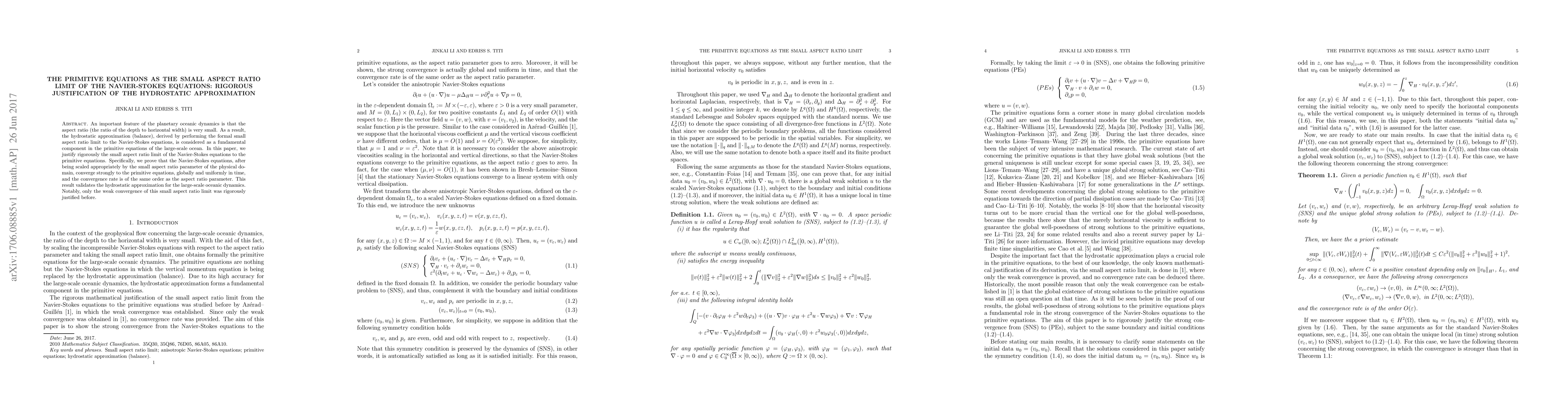 This paper rigorously justifies the small aspect ratio limit of the Navier-Stokes equations, proving their strong convergence to the primitive equations of oceanic dynamics. The study confirms the validity of the hydrostatic approximation for large-scale ocean modeling.