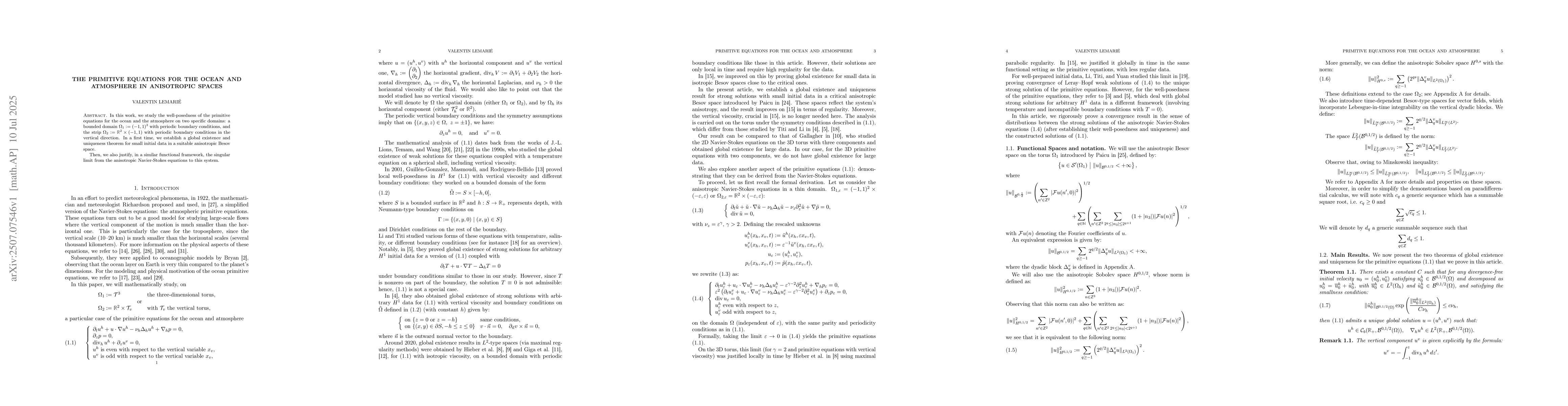 In this work, we study the well-posedness of the primitive equations for the ocean and the atmosphere on two specific domains: a bounded domain $\Omega_1\mathrel{\mathop:}=(-1,1)^3$ with periodic boundary conditions, and the strip $\Omega_2\mathrel{\mathop:}=\mathbb{R}^2\times(-1,1)$ with periodic boundary conditions in the vertical direction. In a first time, we establish a global existence and uniqueness theorem for small initial data in a suitable anisotropic Besov space. Then, we also justify, in a similar functional framework, the singular limit from the anisotropic Navier-Stokes equations to this system.
