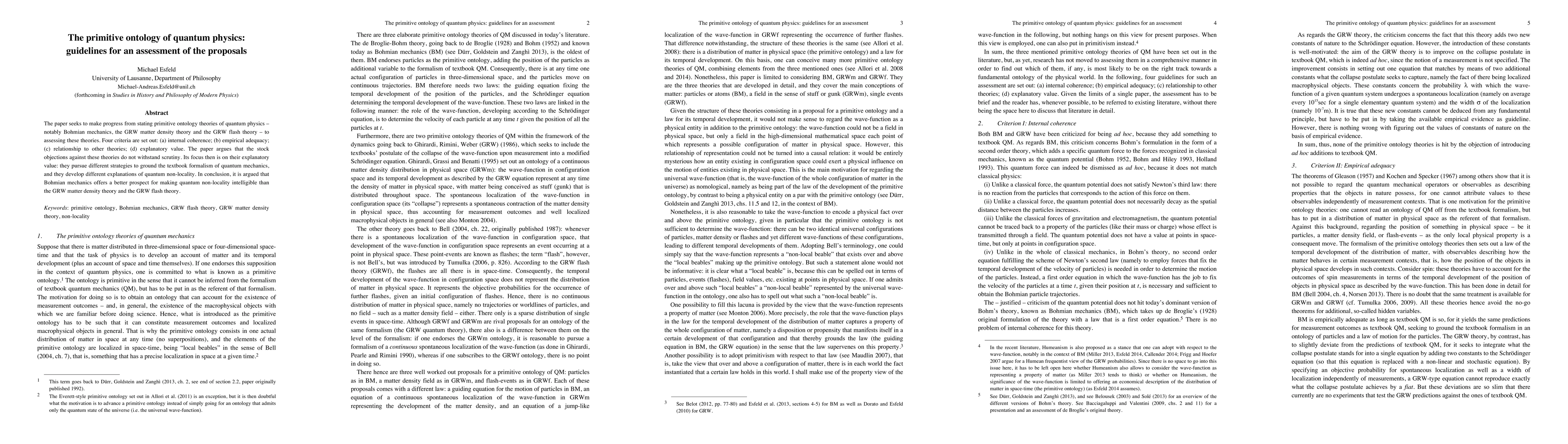 This paper evaluates primitive ontology theories in quantum physics, including Bohmian mechanics and GRW theories, using criteria like internal coherence and explanatory value. It concludes that Bohmian mechanics provides a superior framework for understanding quantum non-locality compared to the GRW matter density and flash theories.