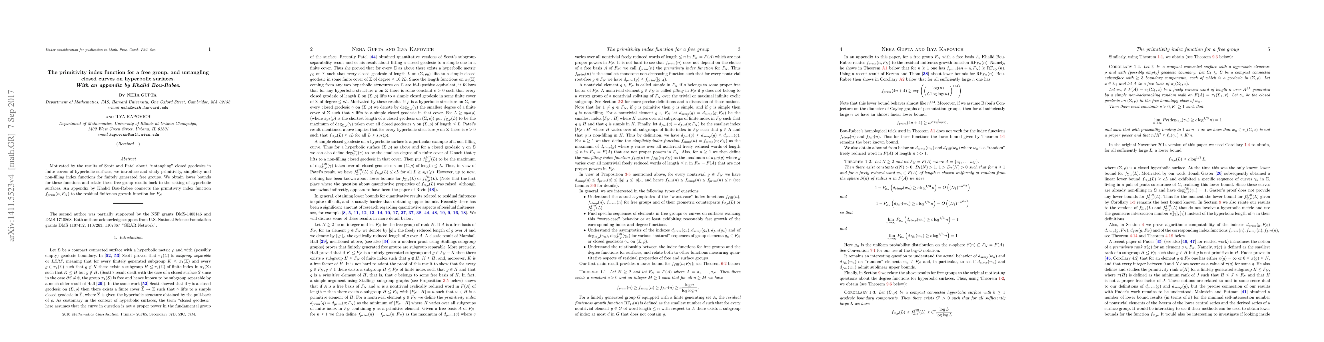 Motivated by the results of Scott and Patel about "untangling" closed geodesics in finite covers of hyperbolic surfaces, we introduce and study primitivity, simplicity and non-filling index functions for finitely generated free groups. We obtain lower bounds for these functions and relate these free group results back to the setting of hyperbolic surfaces. An appendix by Khalid Bou-Rabee connects the primitivity index function to the residual finiteness growth function for $F_N$.