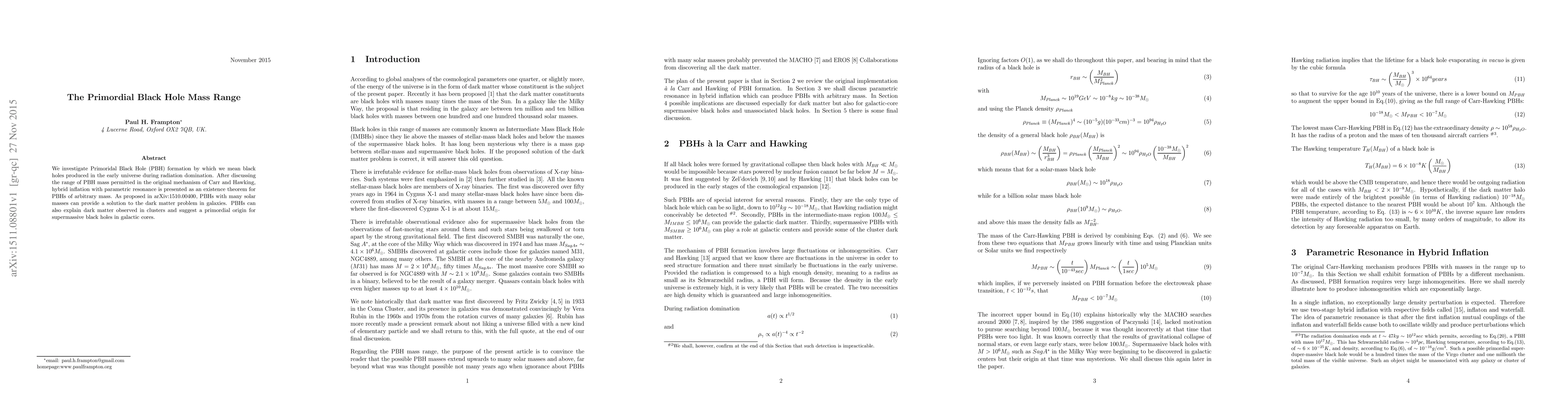 We investigate Primoridal Black Hole (PBH) formation by which we mean black holes produced in the early universe during radiation domination. After discussing the range of PBH mass permitted in the original mechanism of Carr and Hawking, hybrid inflation with parametric resonance is presented as an existence theorem for PBHs of arbitrary mass. As proposed in arXiv:1510.00400, PBHs with many solar masses can provide a solution to the dark matter problem in galaxies. PBHs can also explain dark matter observed in clusters and suggest a primordial origin for supermassive black holes in galactic cores.
