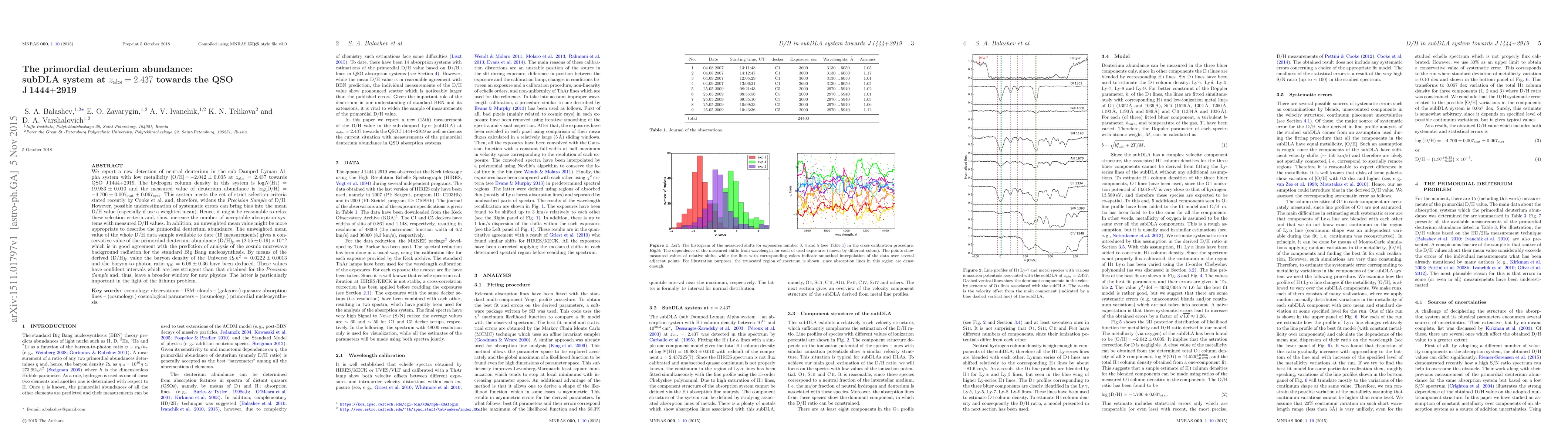 This study reports a new detection of primordial deuterium in a low metallicity sub Damped Lyman Alpha system at z=2.437 towards QSO J1444+2919, with a measured D/H ratio of (-4.706±0.007_(stat)±0.067_(syst)). The findings suggest relaxing strict selection criteria and using an unweighted mean D/H value to better describe the primordial deuterium abundance, resulting in a conservative (D/H)_p=(2.55±0.19)×10^-5. This value aligns with Big Bang nucleosynthesis predictions and allows for broader confidence intervals in baryon density and baryon-to-photon ratio, offering more room for new physics theories, including addressing the lithium problem.