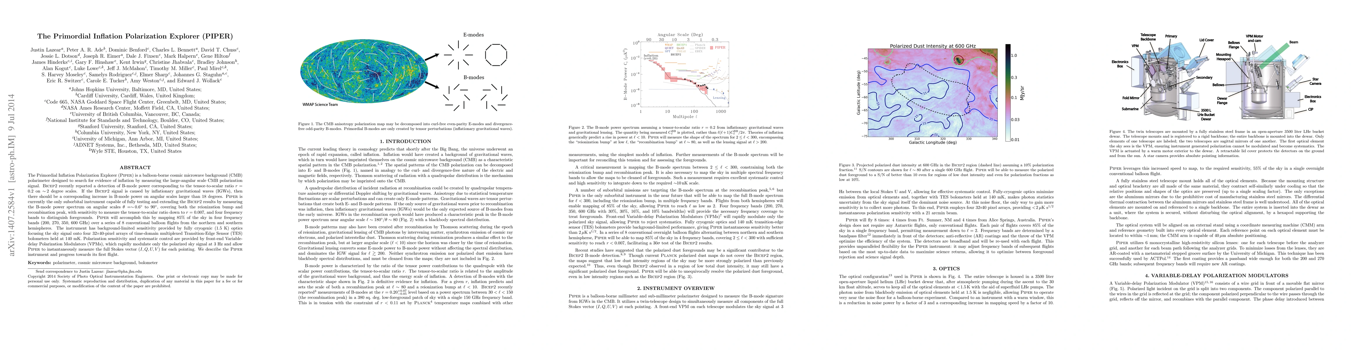 The Primordial Inflation Polarization Explorer (PIPER) is a balloon-borne cosmic microwave background (CMB) polarimeter designed to measure large-angular scale CMB polarization signal, aiming to test and extend BICEP2's results on tensor-to-scalar ratio (r) from ~0.2 to as low as 0.007, with four frequency bands (200, 270, 350, 600 GHz) to distinguish foregrounds.