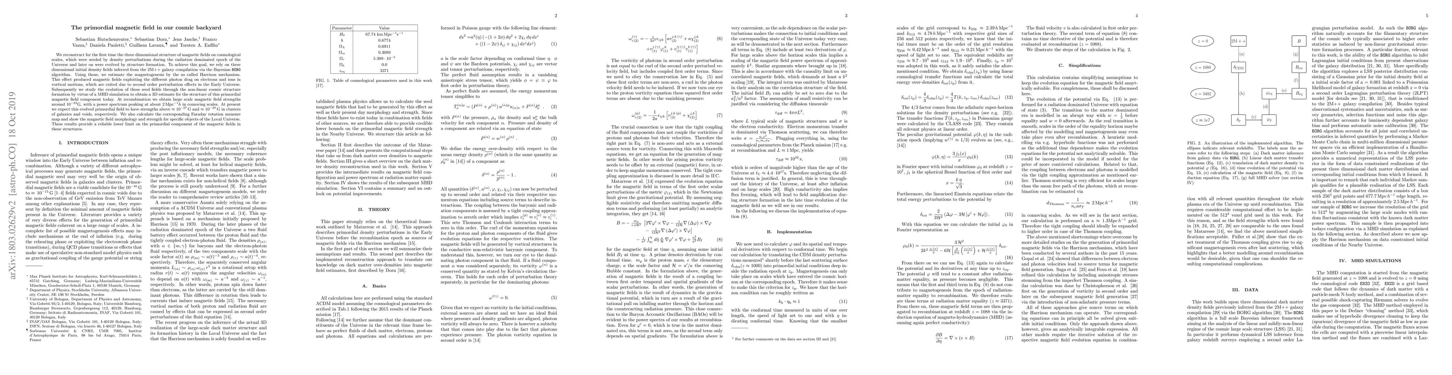We reconstruct the 3D structure of magnetic fields, which were seeded by density perturbations during the radiation dominated epoch of the Universe and later on were evolved by structure formation. To achieve this goal, we rely on three dimensional initial density fields inferred from the 2M++ galaxy compilation via the Bayesian $\texttt{BORG}$ algorithm. Using those, we estimate the magnetogenesis by the so called Harrison mechanism. This effect produced magnetic fields exploiting the different photon drag on electrons and ions in vortical motions, which are exited due to second order perturbation effects in the Early Universe. Subsequently we study the evolution of these seed fields through the non-linear cosmic structure formation by virtue of a MHD simulation to obtain a 3D estimate for the structure of this primordial magnetic field component today. At recombination we obtain a reliable lower limit on the large scale magnetic field strength around $10^{-23} \mathrm{G}$, with a power spectrum peaking at about $ 2\, \mathrm{Mpc}^{-1}h$ in comoving scales. At present we expect this evolved primordial field to have strengthts above $\approx 10^{-27}\, \mathrm{G}$ and $\approx 10^{-29}\, \mathrm{G}$ in clusters of galaxies and voids, respectively. We also calculate the corresponding Faraday rotation measure map and show the magnetic field morphology and strength for specific objects of the Local Universe.