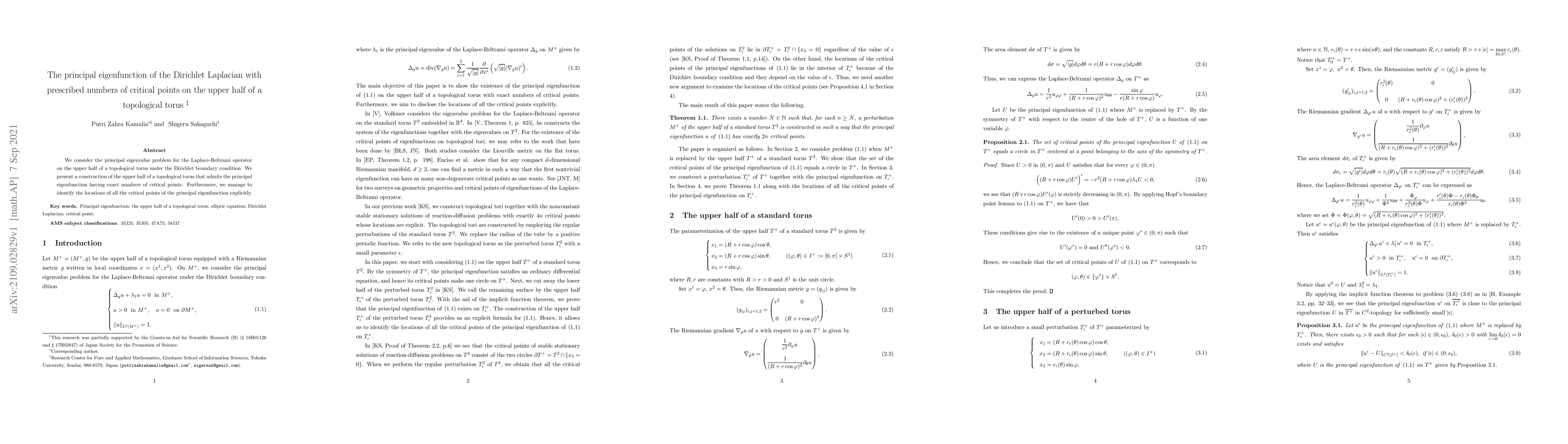 We consider the principal eigenvalue problem for the Laplace-Beltrami operator on the upper half of a topological torus under the Dirichlet boundary condition. We present a construction of the upper half of a topological torus that admits the principal eigenfunction having exact numbers of critical points. Furthermore, we manage to identify the locations of all the critical points of the principal eigenfunction explicitly.