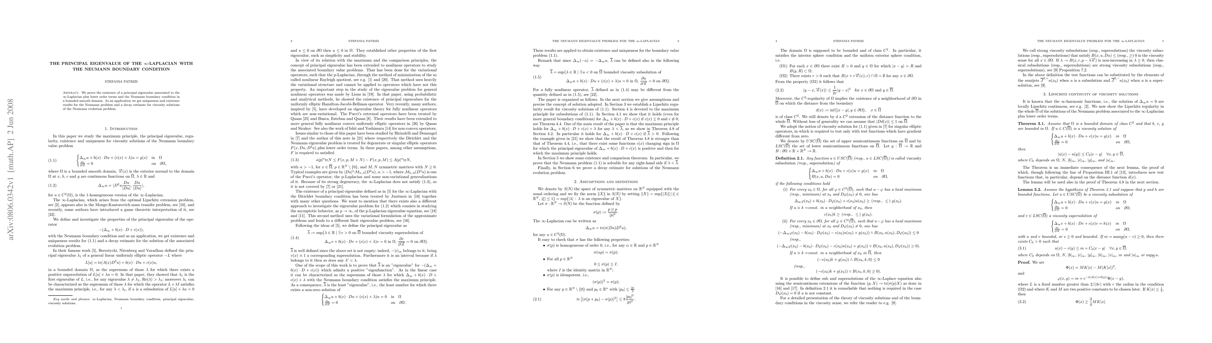 Summary: This paper establishes the existence of a principal eigenvalue for the $\infty$-Laplacian with Neumann boundary conditions in smooth domains, and uses this result to prove uniqueness and existence for the Neumann problem and provide a decay estimate for viscosity solutions of the Neumann evolution problem.