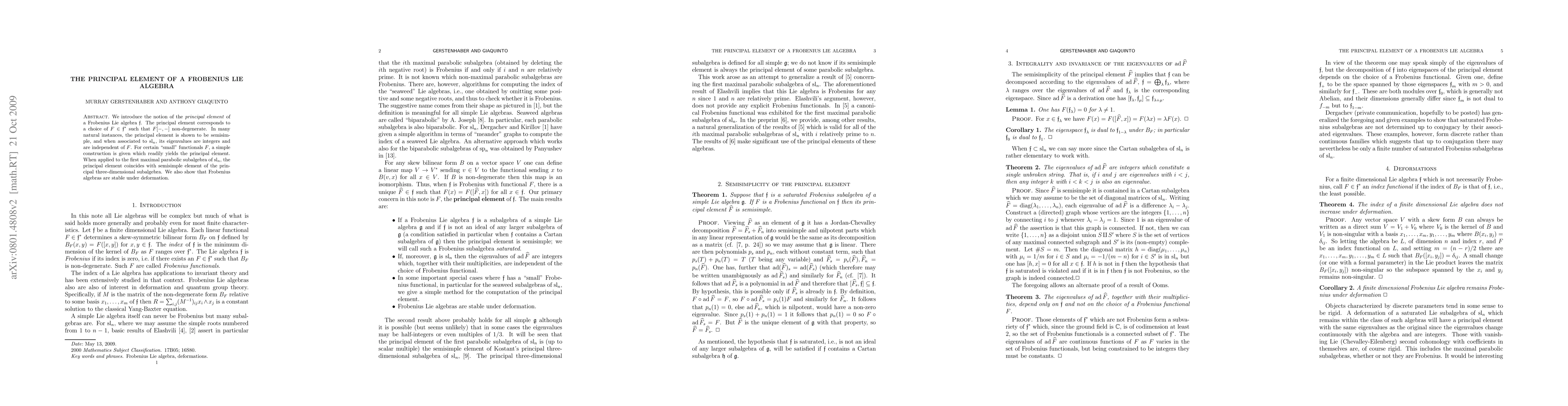 Summary: This paper introduces the concept of the principal element in a Frobenius Lie algebra, demonstrating its semisimplicity in many cases and its connection to the eigenvalues of $\sl_n$. A simple construction method for the principal element is provided, and it is shown to coincide with the semisimple element in the principal three-dimensional subalgebra. The paper concludes by proving the stability of Frobenius algebras under deformation.