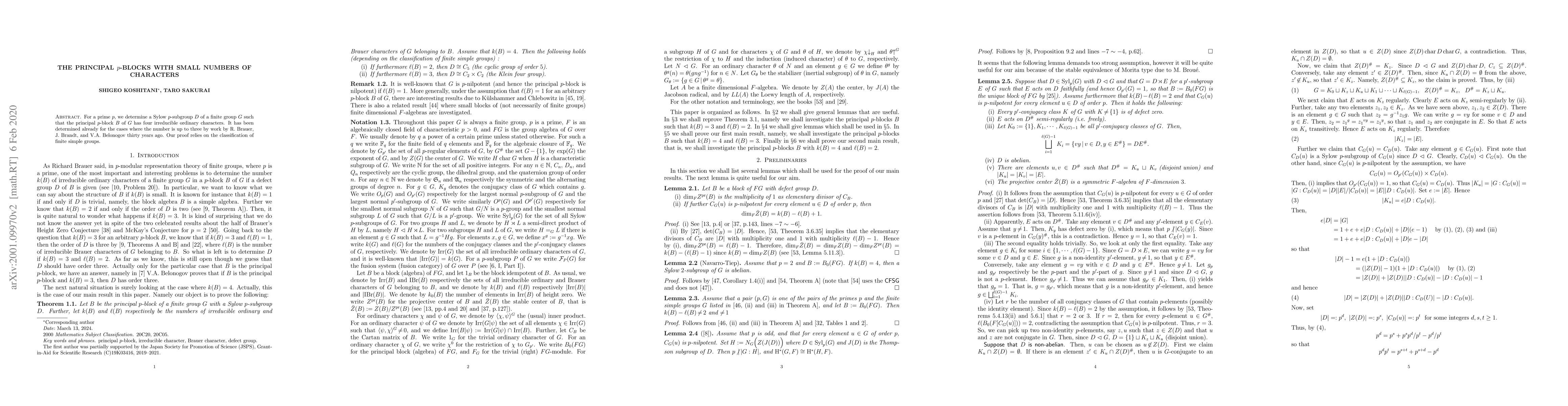 This paper identifies a Sylow $p$-subgroup $D$ for a finite group $G$ where the principal $p$-block $B$ has four irreducible ordinary characters, extending previous work on cases with up to three characters. The proof leverages the classification of finite simple groups.