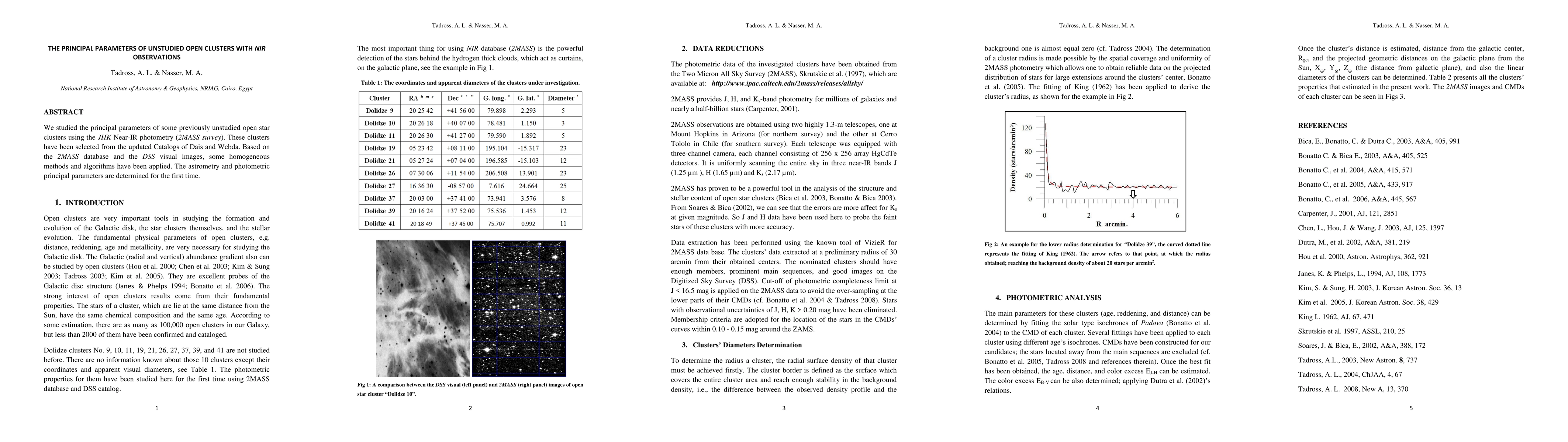 We studied the principal parameters of some previously unstudied open star clusters using the JHK Near-IR photometry (2MASS survey). These clusters have been selected from the updated Catalogs of Dais and Webda. Based on the 2MASS database and the DSS visual images, some homogeneous methods and algorithms have been applied. The astrometry and photometric principal parameters are determined for the first time.