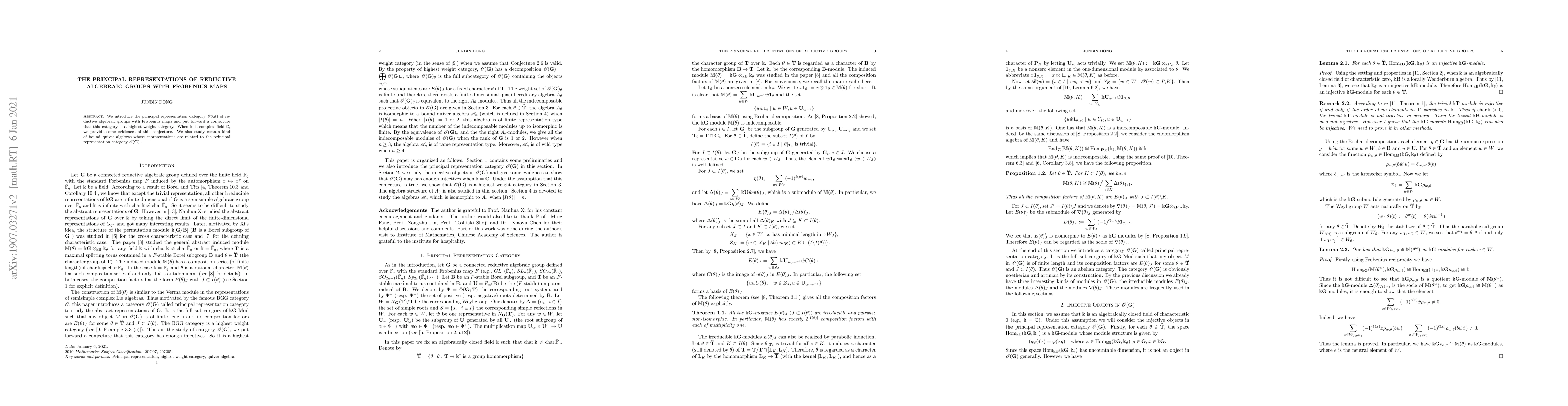 This paper introduces the principal representation category $\mathscr{O}({\bf G})$ of reductive algebraic groups equipped with Frobenius maps, and proposes a conjecture that it forms a highest weight category. Evidence supporting this conjecture is provided when the base field is complex. Additionally, the study explores bound quiver algebras connected to $\mathscr{O}({\bf G})$.