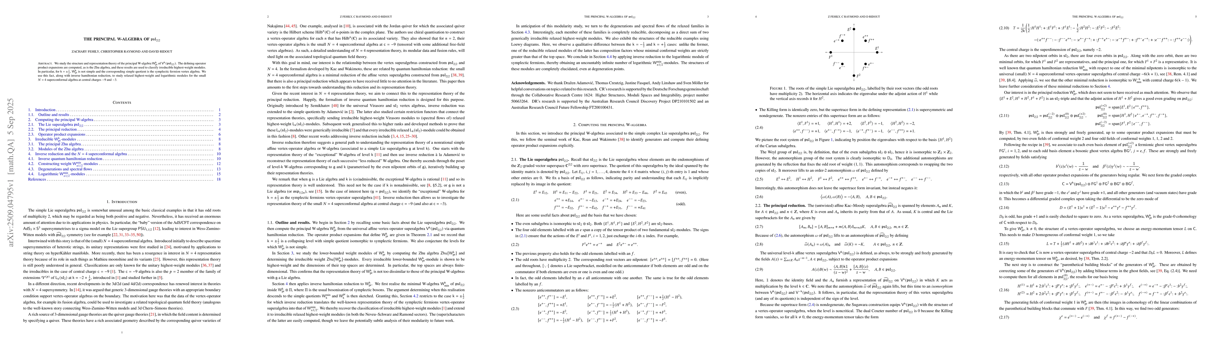 We study the structure and representation theory of the principal W-algebra $\mathsf{W}^{\mathsf{k}}_{\mathrm{pr}}$ of $\mathsf{V}^{\mathsf{k}}(\mathfrak{psl}_{2|2})$. The defining operator product expansions are computed, as is the Zhu algebra, and these results are used to classify irreducible highest-weight modules. In particular, for $\mathsf{k} = \pm \frac{1}{2}$, $\mathsf{W}^{\mathsf{k}}_{\mathrm{pr}}$ is not simple and the corresponding simple quotient is the symplectic fermion vertex algebra. We use this fact, along with inverse hamiltonian reduction, to study relaxed highest-weight and logarithmic modules for the small $N=4$ superconformal algebra at central charges $-9$ and $-3$.