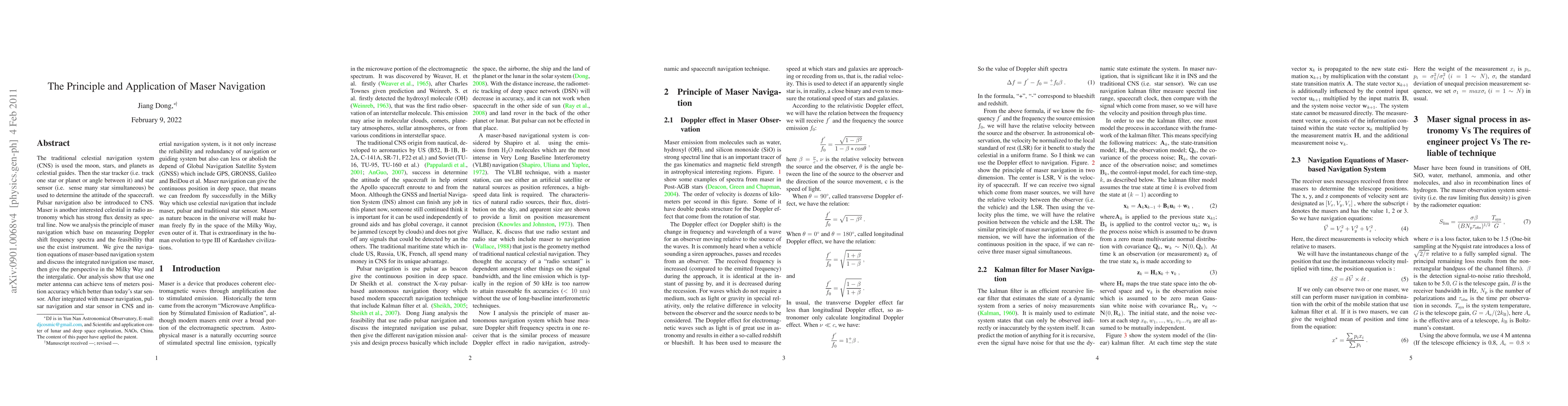 The traditional celestial navigation system (CNS) is used the moon, stars, and planets as celestial guides. Then the star tracker (i.e. track one star or planet or angle between it) and star sensor (i.e. sense many star simultaneous) be used to determine the attitude of the spacecraft. Pulsar navigation also be introduced to CNS. Maser is another interested celestial in radio astronomy which has strong flux density as spectral line. Now we analysis the principle of maser navigation which base on measuring Doppler shift frequency spectra and the feasibility that use the exist instrument. We give the navigation equations of maser-based navigation system and discuss the integrated navigation use maser, then give the perspective in the Milky Way and the intergalatic. Our analysis show that use one meter antenna can achieve tens of meters position accuracy which better than today's star sensor. After integrated with maser navigation, pulsar navigation and star sensor in CNS and inertial navigation system, is it not only increase the reliability and redundancy of navigation or guiding system but also can less or abolish the depend of Global Navigation Satellite System (GNSS) which include GPS, GRONSS, Galileo and BeiDou et al. Maser navigation can give the continuous position in deep space, that means we can freedom fly successfully in the Milky Way which use celestial navigation that include maser, pulsar and traditional star sensor. Maser as nature beacon in the universe will make human freely fly in the space of the Milky Way, even outer of it. That is extraordinary in the human evolution to type III of Kardashev civilizations.