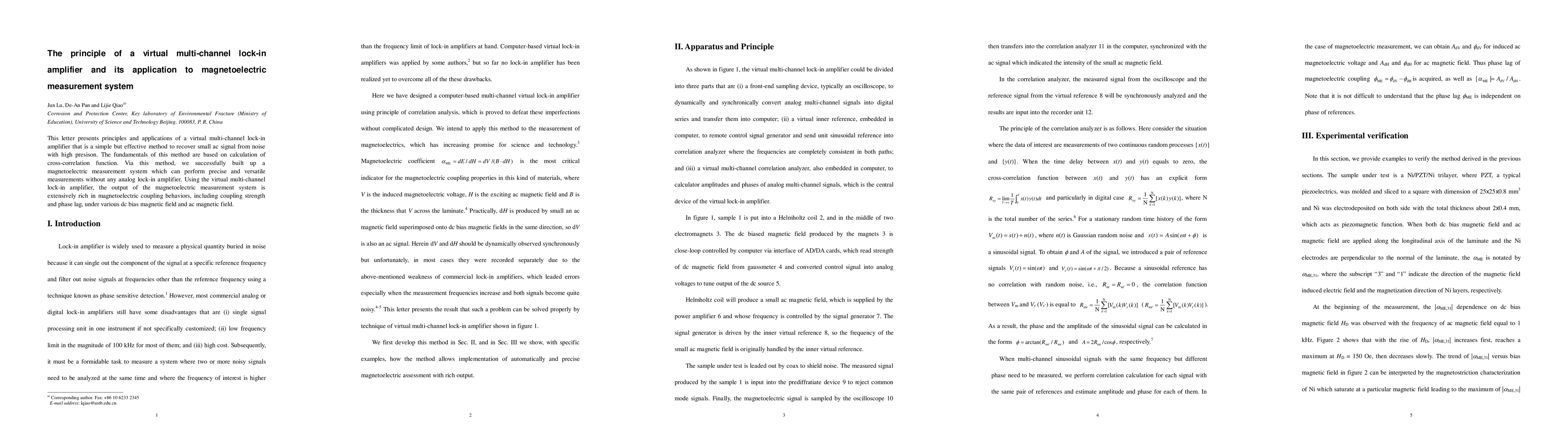 This paper introduces a virtual multi-channel lock-in amplifier based on cross-correlation function calculations for precise recovery of small ac signals from noise. The method enables the development of a magnetoelectric measurement system without analog lock-in amplifiers, providing detailed insights into magnetoelectric coupling behaviors.