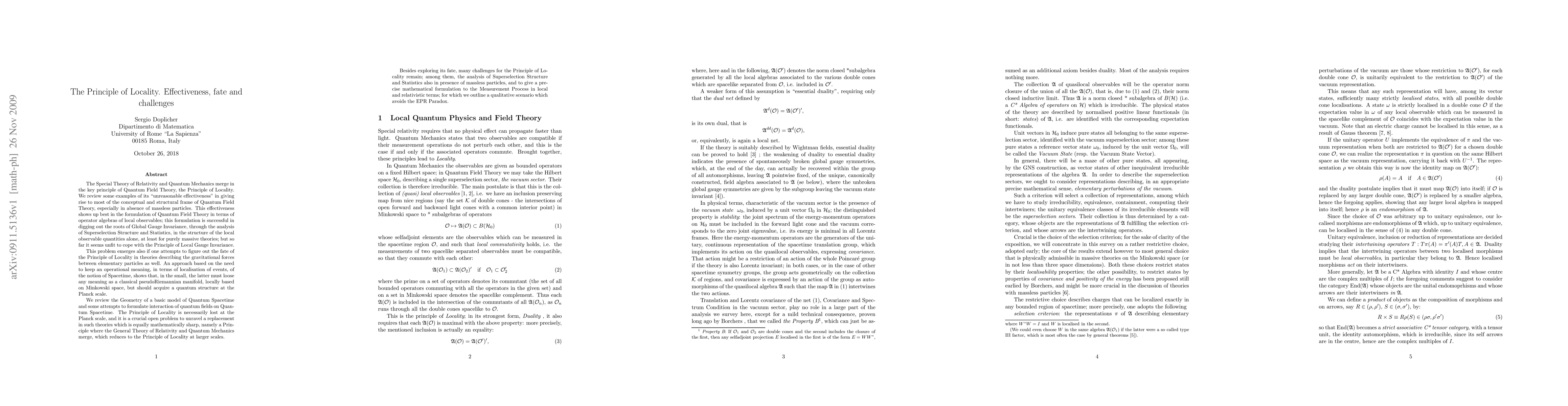 The Special Theory of Relativity and Quantum Mechanics merge in the key principle of Quantum Field Theory, the Principle of Locality. We review some examples of its ``unreasonable effectiveness'' (which shows up best in the formulation of Quantum Field Theory in terms of operator algebras of local observables) in digging out the roots of Global Gauge Invariance in the structure of the local observable quantities alone, at least for purely massive theories; but to deal with the Principle of Local Gauge Invariance is still a problem in this frame. This problem emerges also if one attempts to figure out the fate of the Principle of Locality in theories describing the gravitational forces between elementary particles as well. Spacetime should then acquire a quantum structure at the Planck scale, and the Principle of Locality is lost. It is a crucial open problem to unravel a replacement in such theories which is equally mathematically sharp and reduces to the Principle of Locality at larger scales. Besides exploring its fate, many challenges for the Principle of Locality remain; among them, the analysis of Superselection Structure and Statistics also in presence of massless particles, and to give a precise mathematical formulation to the Measurement Process in local and relativistic terms; for which we outline a qualitative scenario which avoids the EPR Paradox.