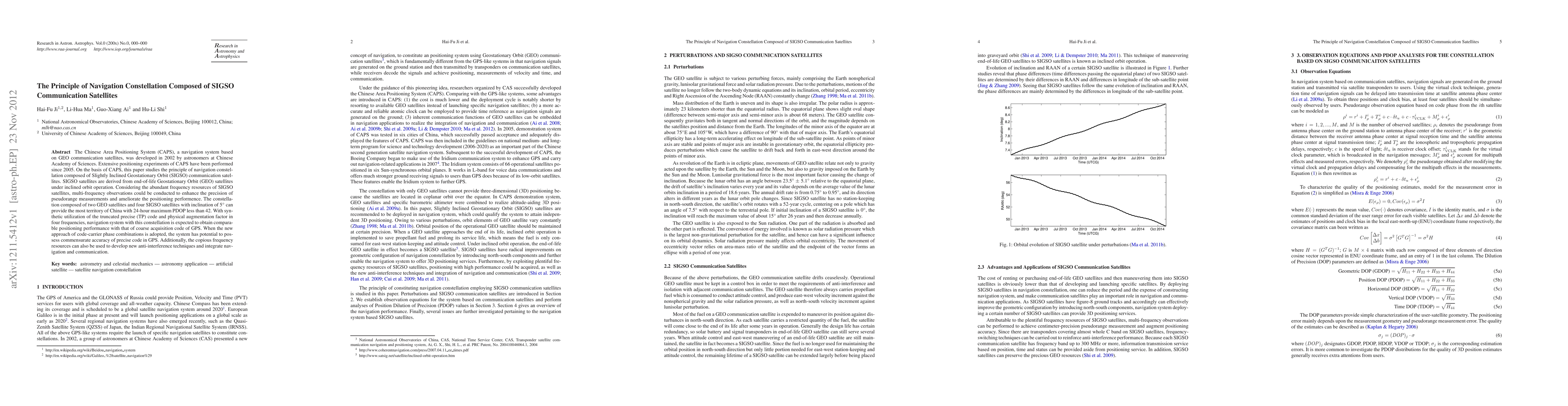 This paper explores the navigation constellation principle using Slightly Inclined Geostationary Orbit (SIGSO) communication satellites, which are derived from end-of-life GEO satellites. The proposed constellation, consisting of two GEO and four SIGSO satellites, aims to enhance positioning precision through multi-frequency observations and code-carrier phase combinations, potentially achieving comparable performance to GPS.
