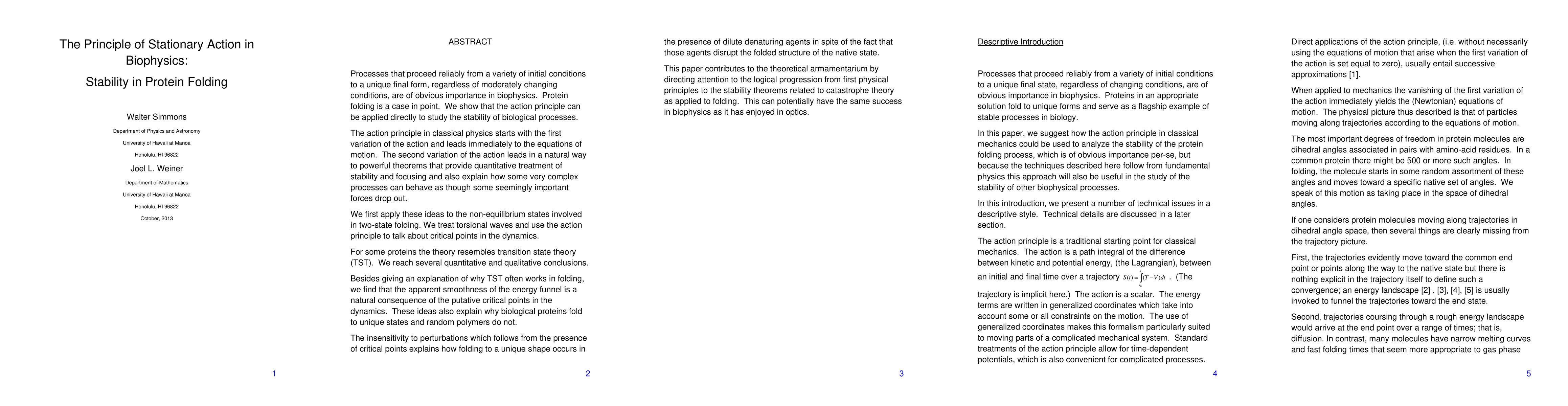 Processes that proceed reliably from a variety of initial conditions to a unique final form, regardless of moderately changing conditions, are of obvious importance in biophysics. Protein folding is a case in point. We show that the action principle can be applied directly to study the stability of biological processes. The action principle in classical physics starts with the first variation of the action and leads immediately to the equations of motion. The second variation of the action leads in a natural way to powerful theorems that provide quantitative treatment of stability and focusing and also explain how some very complex processes can behave as though some seemingly important forces drop out. We first apply these ideas to the non-equilibrium states involved in two-state folding. We treat torsional waves and use the action principle to talk about critical points in the dynamics. For some proteins the theory resembles TST. We reach several quantitative and qualitative conclusions. Besides giving an explanation of why TST often works in folding, we find that the apparent smoothness of the energy funnel is a natural consequence of the putative critical points in the dynamics. These ideas also explain why biological proteins fold to unique states and random polymers do not. The insensitivity to perturbations which follows from the presence of critical points explains how folding to a unique shape occurs in the presence of dilute denaturing agents in spite of the fact that those agents disrupt the folded structure of the native state. This paper contributes to the theoretical armamentarium by directing attention to the logical progression from first physical principles to the stability theorems related to catastrophe theory as applied to folding. This can potentially have the same success in biophysics as it has enjoyed in optics.