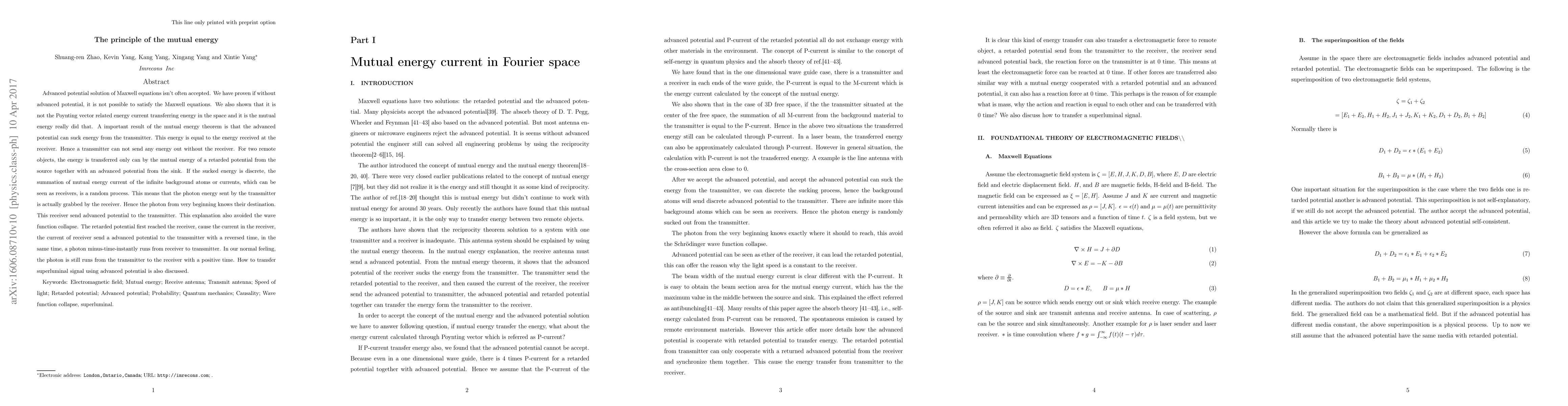 Advanced potential solution of Maxwell equations isn't often accepted. We have proven if without advanced potential, it is not possible to satisfy the Maxwell equations. We also shown that it is not the Poynting vector related energy current transferring energy in the space and it is the mutual energy really did that. A important result of the mutual energy theorem is that the advanced potential can suck energy from the transmitter. This energy is equal to the energy received at the receiver. Hence a transmitter can not send any energy out without the receiver. For two remote objects, the energy is transferred only can by the mutual energy of a retarded potential from the source together with an advanced potential from the sink. If the sucked energy is discrete, the summation of mutual energy current of the infinite background atoms or currents, which can be seen as receivers, is a random process. This means that the photon energy sent by the transmitter is actually grabbed by the receiver. Hence the photon from very beginning knows their destination. This receiver send advanced potential to the transmitter. This explanation also avoided the wave function collapse. The retarded potential first reached the receiver, cause the current in the receiver, the current of receiver send a advanced potential to the transmitter with a reversed time, in the same time, a photon minus-time-instantly runs from receiver to transmitter. In our normal feeling, the photon is still runs from the transmitter to the receiver with a positive time. How to transfer superluminal signal using advanced potential is also discussed.Maxwell equations as principle of the theory of the electromagnetic fields is replaced by the mutual energy principle.