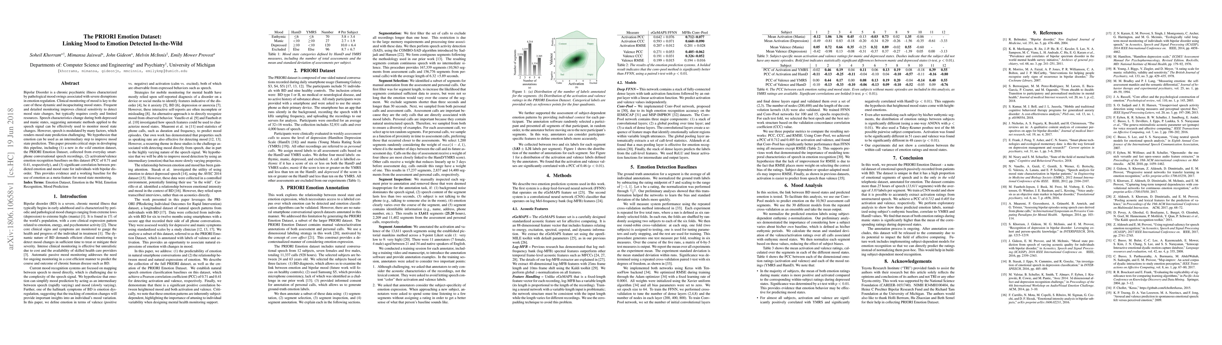 The PRIORI Emotion Dataset enables mood state monitoring in bipolar disorder by linking detected emotions from everyday smartphone conversations to mood fluctuations, showing a significant correlation between predicted emotions and mood states. This offers a practical baseline for using emotion as a meta-feature to enhance clinical sensitivity in mood state detection.