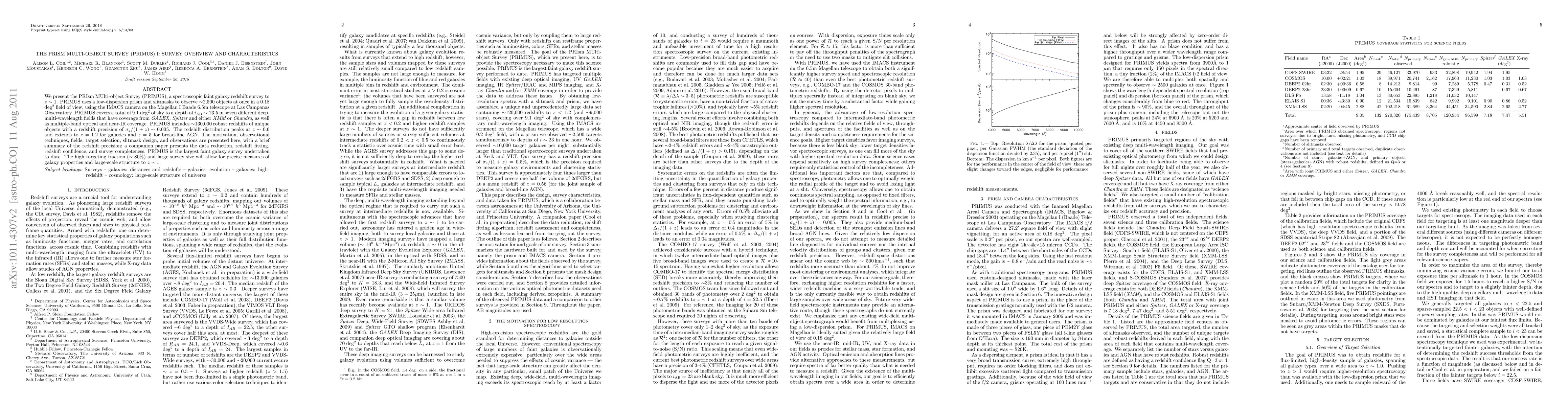 PRIMUS is a large spectroscopic faint galaxy redshift survey using the IMACS camera on the Magellan telescope, targeting ~130,000 galaxies and AGNs up to z=1.2. It covers 9.1 deg^2 with a high targeting fraction, enabling precise galaxy property and large-scale structure measurements.