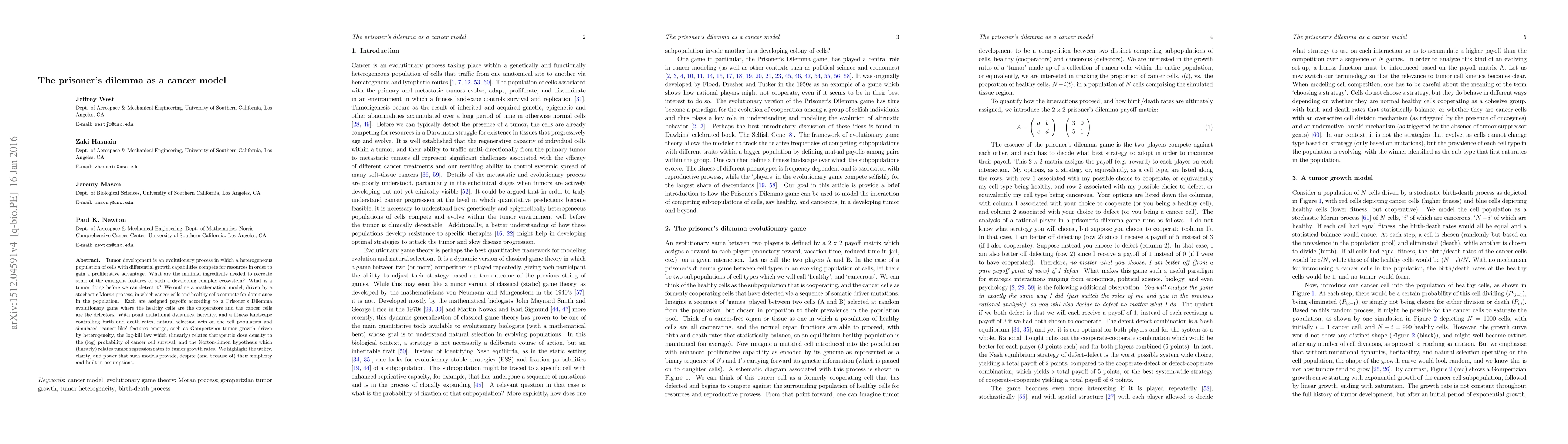 Tumor development is an evolutionary process in which a heterogeneous population of cells with differential growth capabilities compete for resources in order to gain a proliferative advantage. What are the minimal ingredients needed to recreate some of the emergent features of such a developing complex ecosystem? What is a tumor doing before we can detect it? We outline a mathematical model, driven by a stochastic Moran process, in which cancer cells and healthy cells compete for dominance in the population. Each are assigned payoffs according to a Prisoner's Dilemma evolutionary game where the healthy cells are the cooperators and the cancer cells are the defectors. With point mutational dynamics, heredity, and a fitness landscape controlling birth and death rates, natural selection acts on the cell population and simulated "cancer-like" features emerge, such as Gompertzian tumor growth driven by heterogeneity, the log-kill law which (linearly) relates therapeutic dose density to the (log) probability of cancer cell survival, and the Norton-Simon hypothesis which (linearly) relates tumor regression rates to tumor growth rates. We highlight the utility, clarity, and power that such models provide, despite (and because of) their simplicity and built-in assumptions.