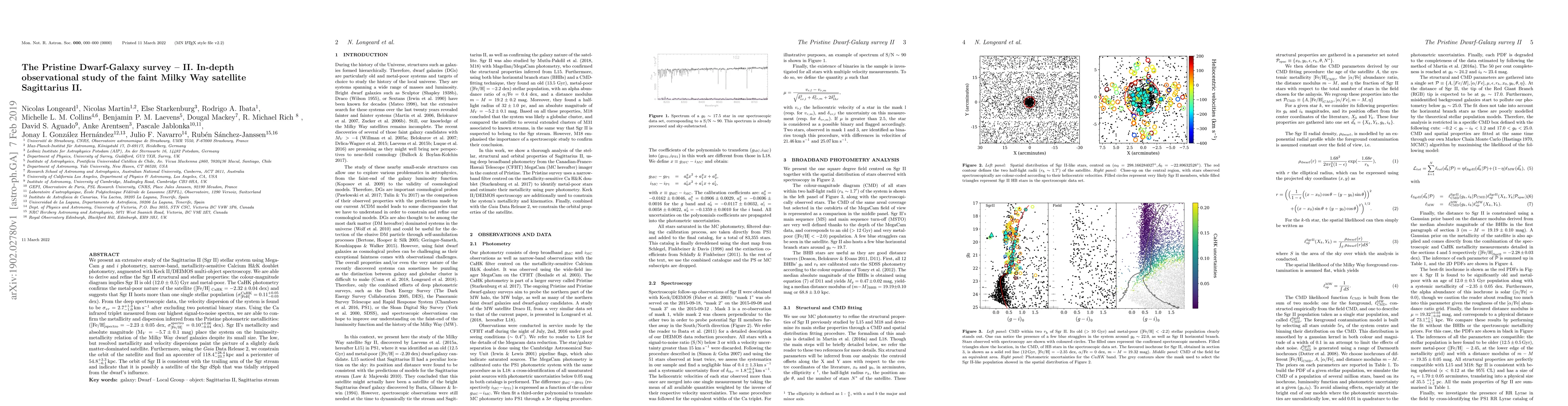 We present an extensive study of the Sagittarius II (Sgr II) stellar system using MegaCam g and i photometry, narrow-band, metallicity-sensitive Calcium H&K doublet photometry, augmented with Keck II/DEIMOS multi-object spectroscopy. We are able to derive and refine the Sgr II structural and stellar properties: the colour-magnitude diagram implies Sgr II is old (12.0 +- 0.5 Gyr) and metal-poor. The CaHK photometry confirms the metal-poor nature of the satellite ([Fe/H]CaHK = -2.32 +- 0.04 dex) and suggests that Sgr II hosts more than one single stellar population ({\sigma} CaHK = 0.11+0.05-0.03 dex). From the deep spectroscopic data, the velocity dispersion of the system is found to be {\sigma}vr = 2.7+1.3-1.0 km s-1 after excluding two potential binary stars. Using the Ca infrared triplet measured from our highest signal-to-noise spectra, we are able to confirm the metallicity and dispersion inferred from the Pristine photometric metallicities: ([Fe/H] = -2.23 +- 0.05 dex, {\sigma}spectro = 0.10+0.06-0.04 dex). Sgr II's metallicity and absolute magnitude (MV = -5.7 +- 0.1 mag) place the system on the luminosity-metallicity relation of the Milky Way dwarf galaxies despite its small size. The low, but resolved metallicity and velocity dispersions paint the picture of a slightly dark matter-dominated satellite. Furthermore, using the Gaia Data Release 2, we constrain the orbit of the satellite and find an apocenter of 118.4+28.4-23.7 kpc and a pericenter of 54.8+3.3-6.1 kpc. The orbit of Sgr II is consistent with the trailing arm of the Sgr stream and indicates that it is possibly a satellite of the Sgr dSph that was tidally stripped from the dwarf's influence.
