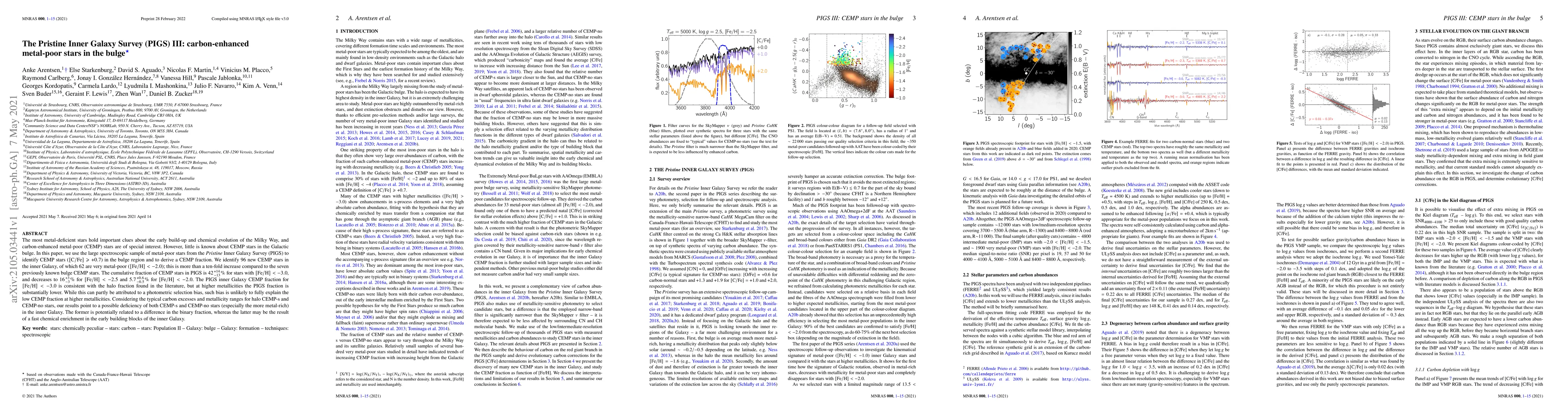 The Pristine Inner Galaxy Survey (PIGS) identifies 96 new carbon-enhanced metal-poor (CEMP) stars in the Galactic bulge, significantly increasing prior knowledge. The CEMP fraction in the inner Galaxy is higher than in the halo at low metallicities but lower at higher metallicities, suggesting differences in binary fractions and early chemical enrichment processes.