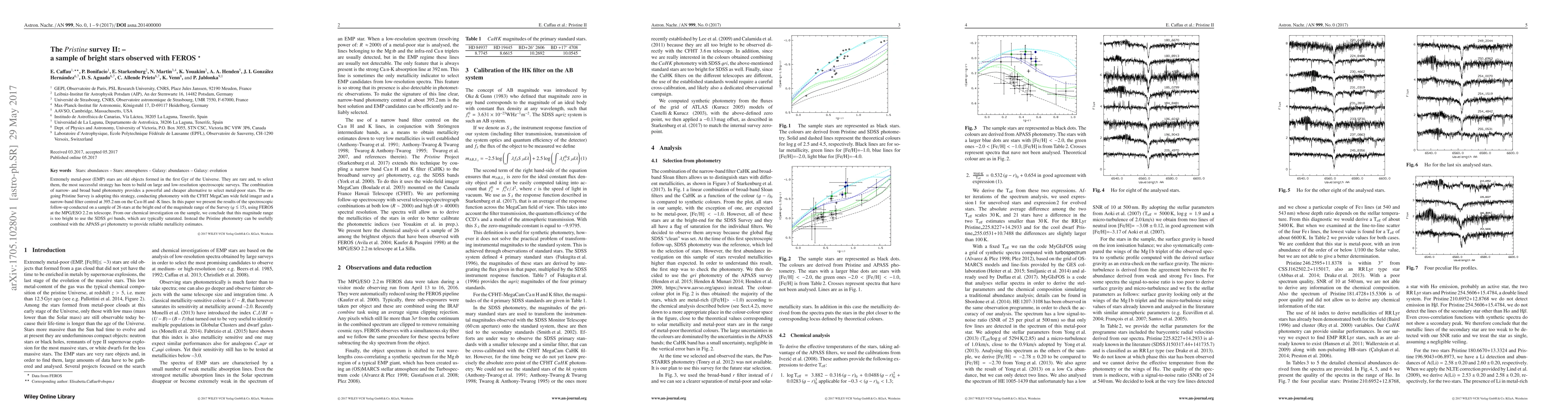 Extremely metal-poor (EMP) stars are old objects formed in the first Gyr of the Universe. They are rare and, to select them, the most successful strategy has been to build on large and low-resolution spectroscopic surveys. The combination of narrow- and broad band photometry provides a powerful and cheaper alternative to select metal-poor stars. The on-going Pristine Survey is adopting this strategy, conducting photometry with the CFHT MegaCam wide field imager and a narrow-band filter centred at 395.2 nm on the CaII-H and -K lines. In this paper we present the results of the spectroscopic follow-up conducted on a sample of 26 stars at the bright end of the magnitude range of the Survey (g<=15), using FEROS at the MPG/ESO 2.2 m telescope. From our chemical investigation on the sample, we conclude that this magnitude range is too bright to use the SDSS gri bands, which are typically saturated. Instead the Pristine photometry can be usefully combined with the APASS gri photometry to provide reliable metallicity estimates.