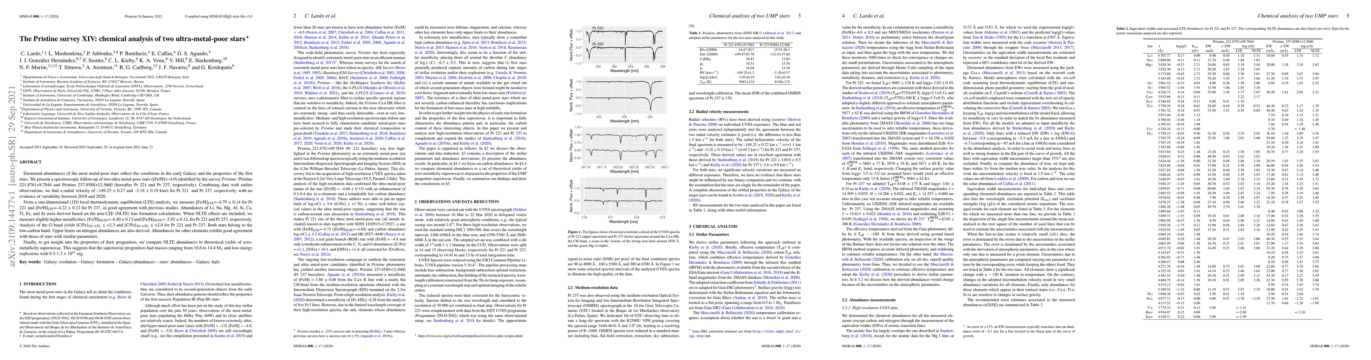 The paper presents a detailed chemical analysis of two ultra metal-poor stars, including NLTE abundance corrections for various elements, and compares their compositions to theoretical supernova yields.