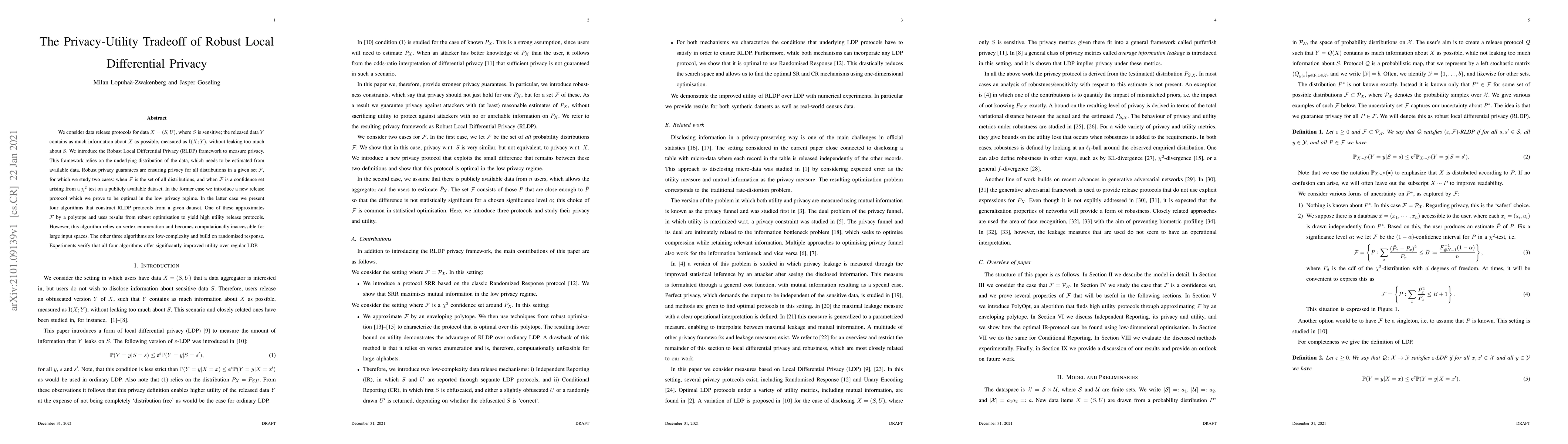 This paper introduces the Robust Local Differential Privacy (RLDP) framework to balance data utility and privacy in data release protocols. It presents optimal protocols for ensuring privacy across all distributions and four algorithms for constructing RLDP protocols, with two computationally efficient and two that offer high utility but are complex. Experiments show improved utility over regular Local Differential Privacy.