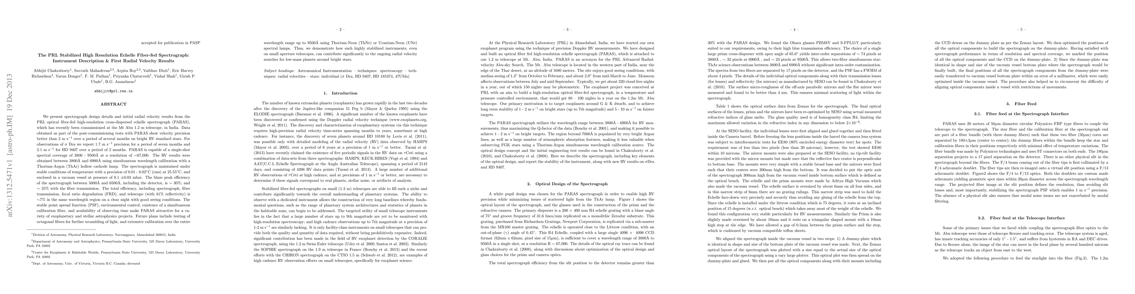This paper describes the design and initial performance of the PARAS spectrograph, recently commissioned at the Mt Abu 1.2 m telescope in India. The instrument achieves radial velocity precision better than 2m/s, with specific results showing 1.7m/s over seven months and 2.1m/s over two months.