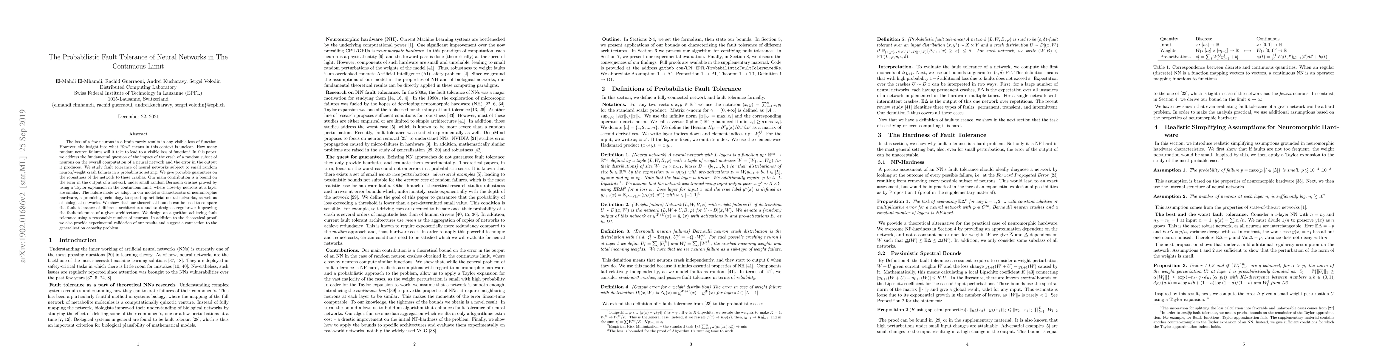 This paper investigates the probabilistic fault tolerance of neural networks under small random neuron failures, providing theoretical bounds on output error in the continuous limit. It demonstrates how these bounds can guide the design of more robust neural architectures and validates the findings experimentally.