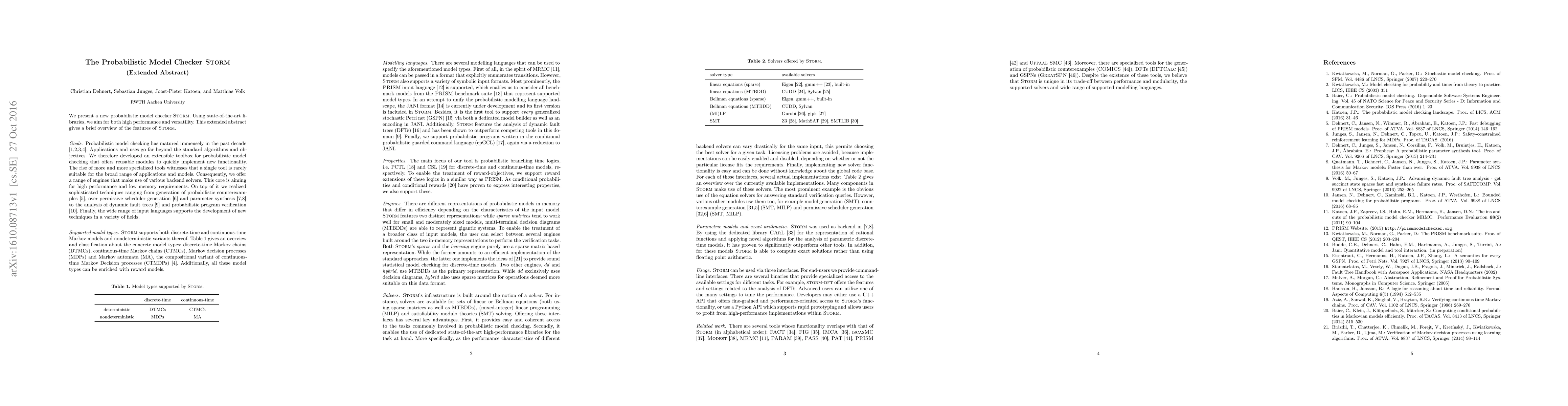Summary: Storm is a newly introduced probabilistic model checker designed for high performance and versatility, leveraging advanced libraries to achieve these goals. This extended abstract provides an overview of its key features.